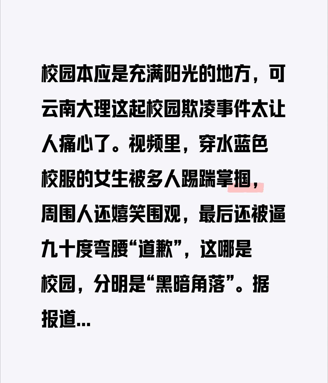 校园本应是阳光普照之所,然而云南大理的这起校园欺凌事件,着实令人痛心疾首。 视频中,身着水蓝色校服的女生惨遭多人踢踹、掌掴,周围人不仅无动于衷,还嬉笑围观,最后女生竟被逼至九十度弯腰“道歉”。这哪里是校园,分明就是“黑暗角落”。 据报道,该女生就读于下关四中正阳校区,其父母还是通过刷视频才知晓孩子的遭遇。所幸紫云派出所已介入调查,教体局也进行了核实处置,还称此事并非近期发生,之前就已处理过。 但对于校园欺凌,必须秉持零容忍的态度。希望严惩施暴者,还受害者一个公道,让校园真正成为安全的港湾。