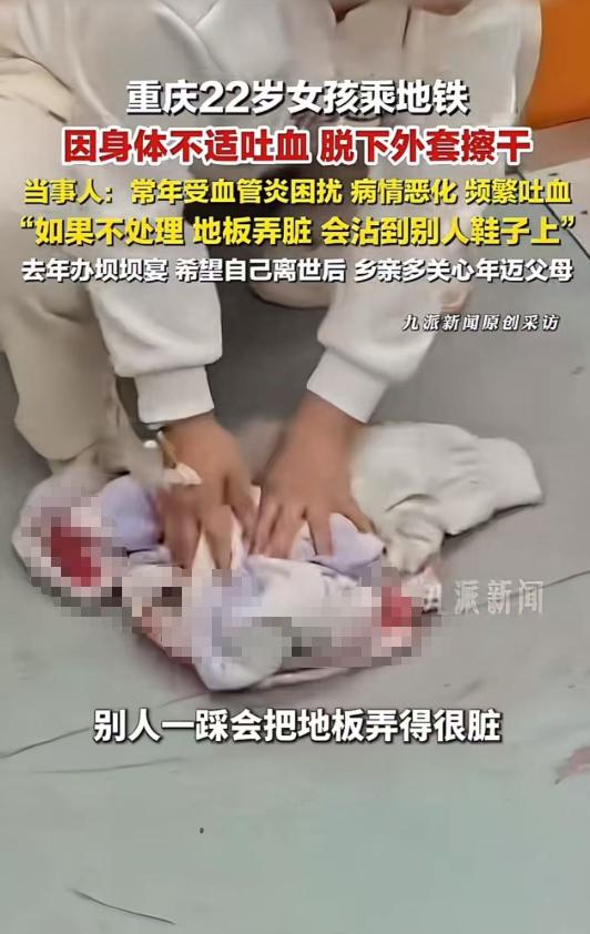 多么善良的姑娘啊!重庆,22岁姑娘在地铁上“吐血”,脱下外套把地擦干,让整个车厢的人都震撼了!当事人:“常年受血管炎困扰,现在病情恶化,频繁吐血。如果不处理,地板会弄脏,会沾到别人鞋子上……” 城市的地铁,车门每一次开合,都裹挟着赶班族的匆忙脚步、学生党背着书包的磕碰声,还有耳机里漏出的细碎音乐。 所有人都埋着头赶路,目光要么盯在手机屏幕上,要么盯着线路牌算着还有几站到站。 那天,一个22岁的年轻姑娘,正准备乘坐地铁。 她的气色并不是很好,嘴唇也泛着淡淡的青白色,她既不抬头看周围,也不跟任何人有眼神接触,就这样安安静静地站在那里。 而那时的她,身体里翻涌起来了强烈的不适感——这种不适已经缠了她很多年。 最开始的咳嗽很轻,轻得像是喉咙里卡了一口痰。 她用手背死死捂着嘴,肩膀绷得紧紧的,头埋得更低,拼尽全力想把这股突如其来的不适感压下去。 可病痛从来都不会顾及人的隐忍,不过十几秒的功夫,她的咳嗽越来越急,越来越压抑。 喉咙里像是有什么东西在往上涌,带着一股腥腥的味道。 她整个身子都不受控制地往下坠了坠,下一秒,一口鲜血直接落在了脚下的地板上。 一般来说,在公共场合突然吐血,身体又极度难受,第一反应多半是慌乱无助。 可这个姑娘的反应,却让在场所有人都愣住了。 她吐完之后,没有先顾着自己的不适,而是第一时间低头看向脚下的地板,眼神里没有对病情的恐惧,反倒满是愧疚和慌乱。 随后,她强忍着喉咙里持续翻涌的不适感,身子晃了晃,一点点解开自己的外套。 等彻底脱下身上这件外套,她把外套紧紧攥在掌心,之后没有丝毫犹豫,就慢慢屈膝往下蹲,仔仔细细用自己的外套擦拭着地板上的血迹。 她擦得特别认真,哪怕身子一直在不停发抖,哪怕喉咙里时不时还会涌出不适的感觉,她还是坚持一点点把血迹擦干净。 旁边几位热心乘客看不下去,有人伸手想扶她起身,有人翻出随身带的纸巾、湿巾往她面前递,还有人想开口询问她的情况。 但都被她轻轻摇着头婉拒了,她只是依旧继续低着头专注擦拭。 等到地板被擦得干干净净,姑娘才一点点站起身。 后来,这一幕被乘客悄悄拍下来发到网上,无数人刷到视频后,都被这个姑娘的举动深深震撼。 大家心疼她的隐忍,敬佩她的教养,更想知道她到底经历着怎样的病痛。 面对外界的关注,姑娘只是简单平静地说出了自己的情况:她常年被血管炎困扰。 这是一种缠人又难治的慢性病,这么多年一直靠药物控制。 可最近病情突然恶化,肺部受到严重影响,开始频繁出现吐血的症状,而这吐血的症状,没有任何规律,随时随地都可能发作。 而对于自己脱外套擦地的举动,她的解释道。 自己突发不适弄脏了公共区域,若是放任不管,后续上车的乘客、身边往来的人,鞋子很容易沾到污渍,会给别人添不必要的麻烦,所以她才会坚持要把这片区域擦干净。 得知女孩的事情后,无数网友留言为她祈福,希望她的病情能得到控制,希望她能少受一点痛苦。 (信息来源:九派新闻)