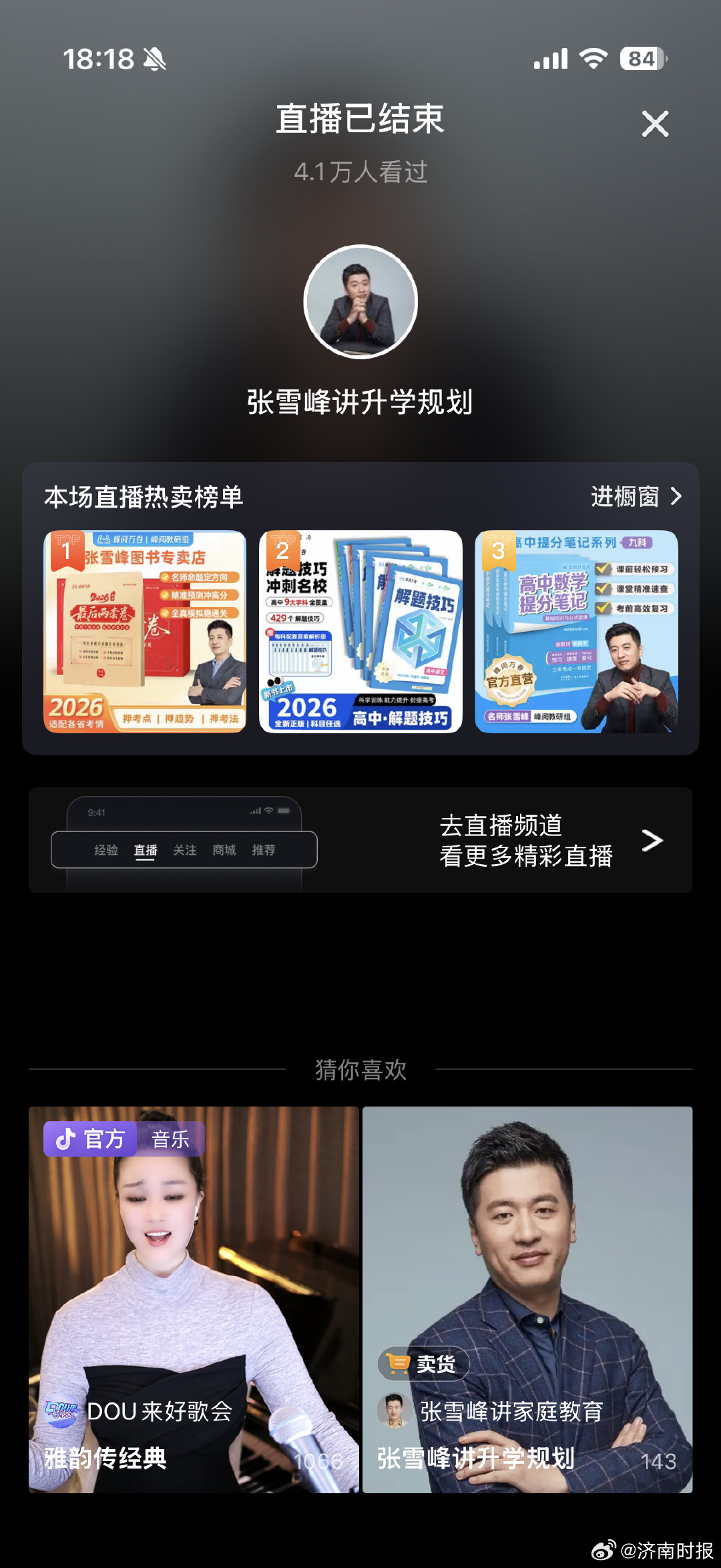 傍晚时分,多个直播间出现出现异常情况。18时05分,小红书账号“张雪峰老师”在面对大量网友询问时,突然终止了直播,下播前主播未作出任何解释。紧接着在18时18分,其抖音矩阵账号“张雪峰讲升学规划”也突然中断了直播。