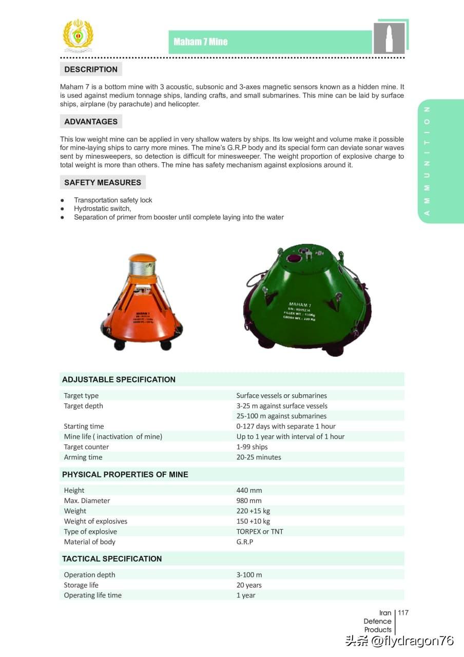 🇮🇷据CBS报道,伊朗已在霍尔木兹海峡布设了多枚“Maham-3”型和“Maham-7”型水雷(附图中展示了取自某出口目录的这些水雷的描述及技术参数)。 然而,关于此次布雷行动规模的各类报道目前仍相互矛盾——从声称已进行大规模部署,到断言实际布设数量尚不足十二枚,各种说法不一而足。 无论如何,伊朗拥有一系列种类繁多的水雷武器库;一旦有此需要,甚至可以通过渔船来实施布雷——而伊朗恰恰拥有数量庞大的渔船船队。