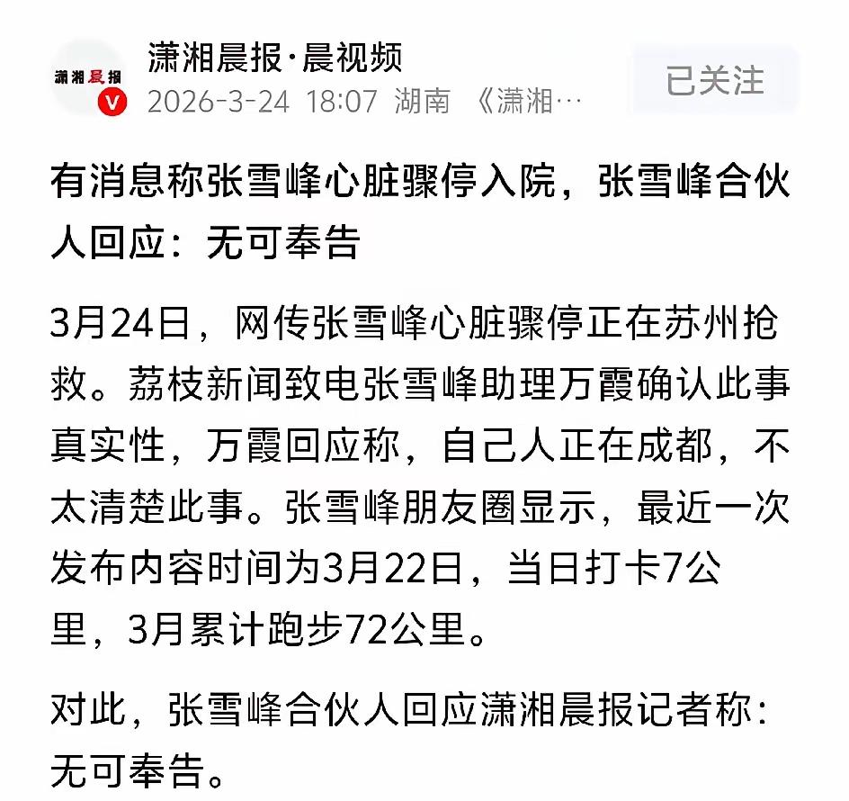 张雪峰被传“抢救”?别急,先看看事实,3月22号他还发朋友圈:7公里跑完,状态不错。结果两天后,网上突然疯传他在抢救。助理直接回:“人在成都,根本不知道啥情况。”合伙人更干脆:“无可奉告。” 大家紧张,是因为他太重要了——这些年帮几千万学生选专业、找工作,几乎是“高考志愿灯塔”。但他自己其实挺注意身体的,常说自己“再忙也得动一动”,每月雷打不动运动打卡。 所以啊,这种突发重病的消息大概率是假的。谣言最爱蹭热度,尤其拿健康说事最抓眼球。但真正关心一个人,不是转发恐慌,而是先冷静查证。
