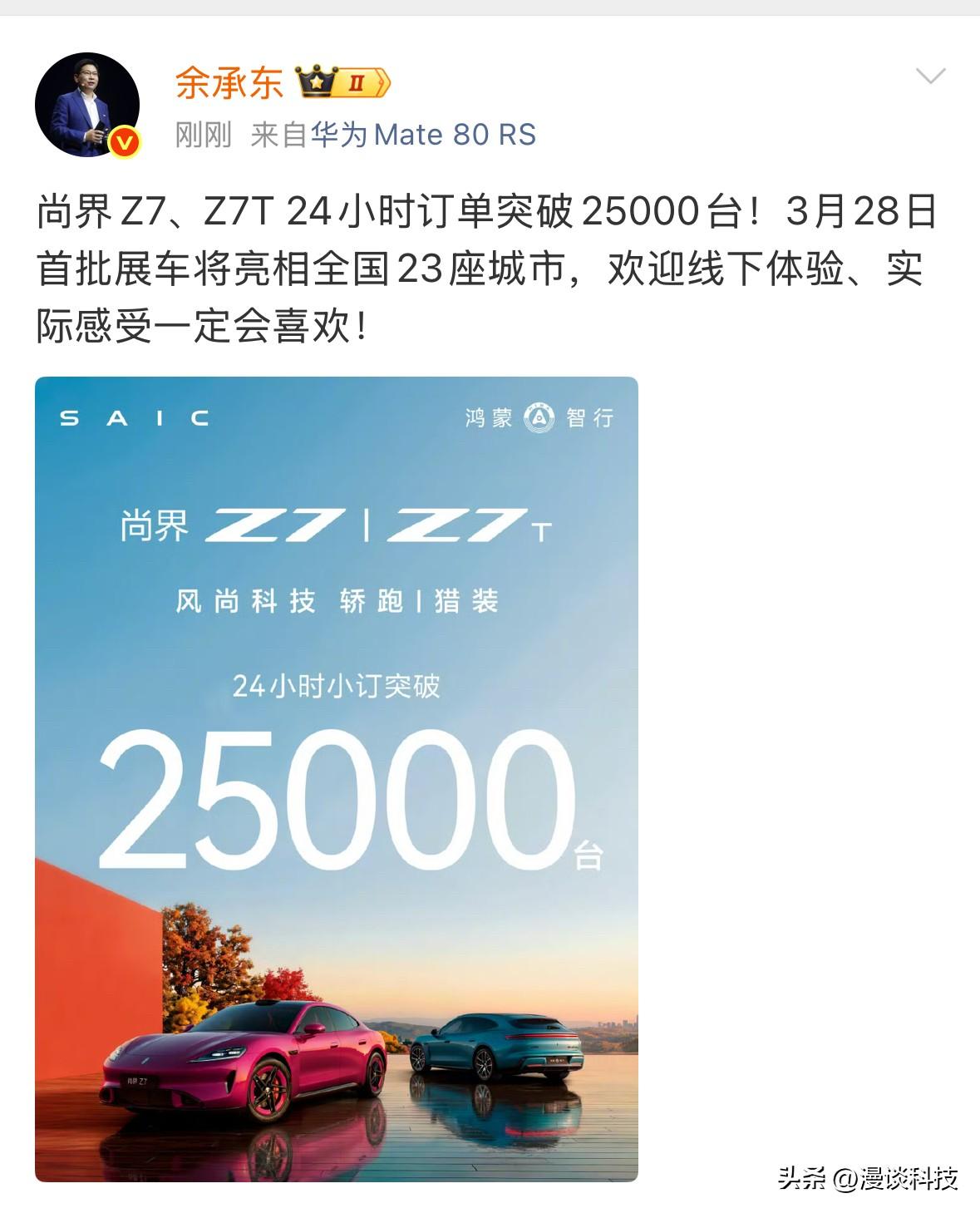 因身体原因没能亲自发布新品的余承东亲自调研,问界M624小时预定60000台。尚界Z7和尚界Z7T,24小时,预定25000台。 华为这两个字就是金字招牌,896线激光雷达就应该傲娇,有技术一定程度上真的可以“遥遥领先”。[赞][赞][赞]