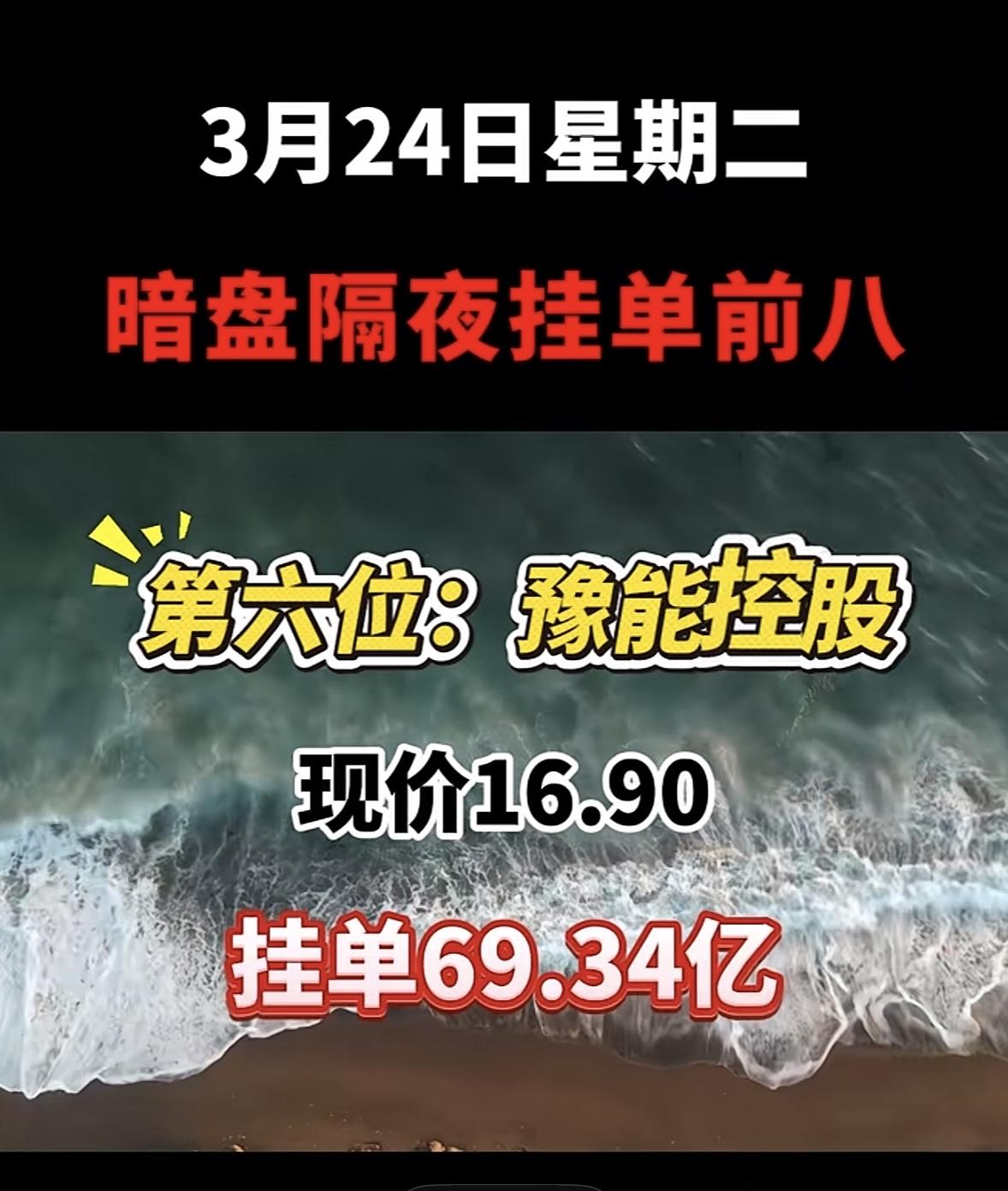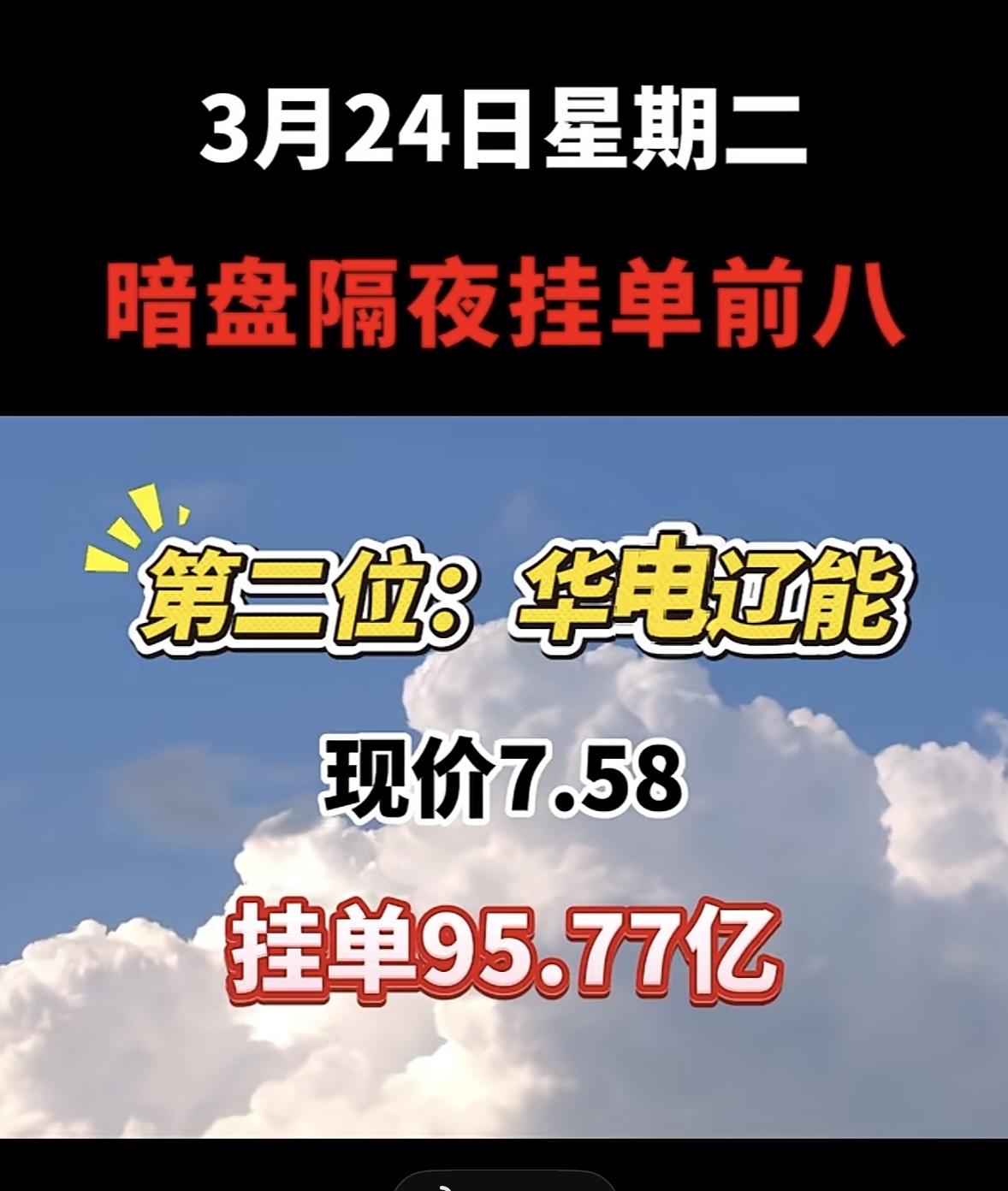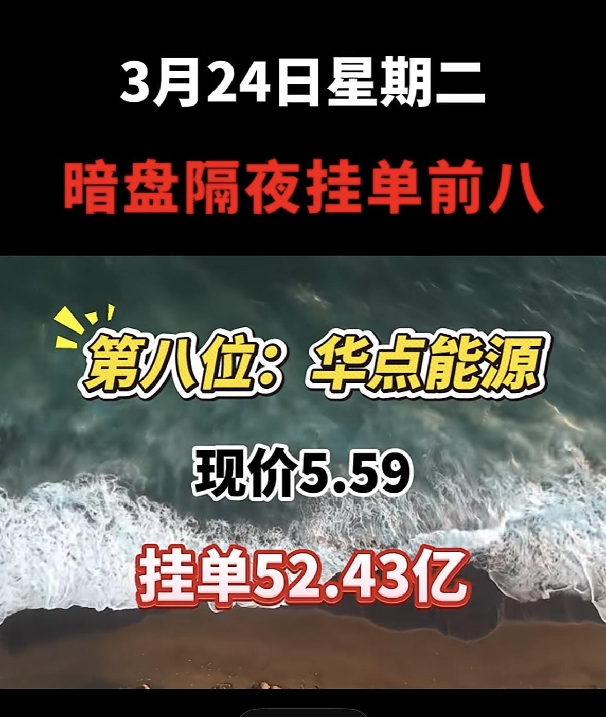 3月25日暗盘隔夜挂单排行榜出炉 华电能源这走势很有看头啊!现价5.59,挂单52.43亿,还是暗盘隔夜挂单前八。这公司名字也是几经变更,从龙电股份到华电能源,中间还经历了*ST华源等。 3月23日暗盘隔夜挂单排名里,华电能源排第二,当时现价5.52,买单84.54亿,卖单16.30亿。和第一名华电辽能比,虽然现价低一点,挂单量也没那么大,但这数据也很亮眼了。看来不少人都盯着华电能源呢,后续走势值得关注,说不定有大行情。