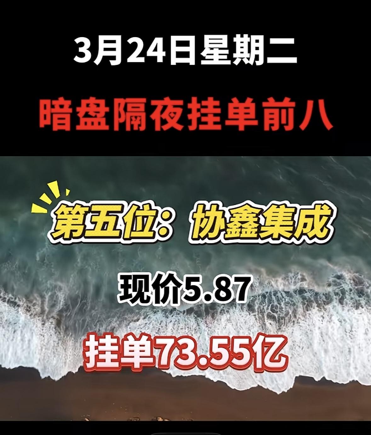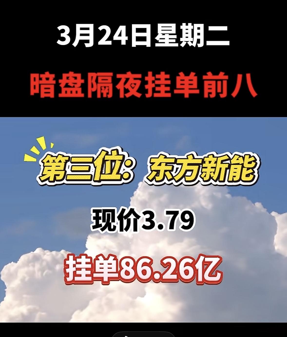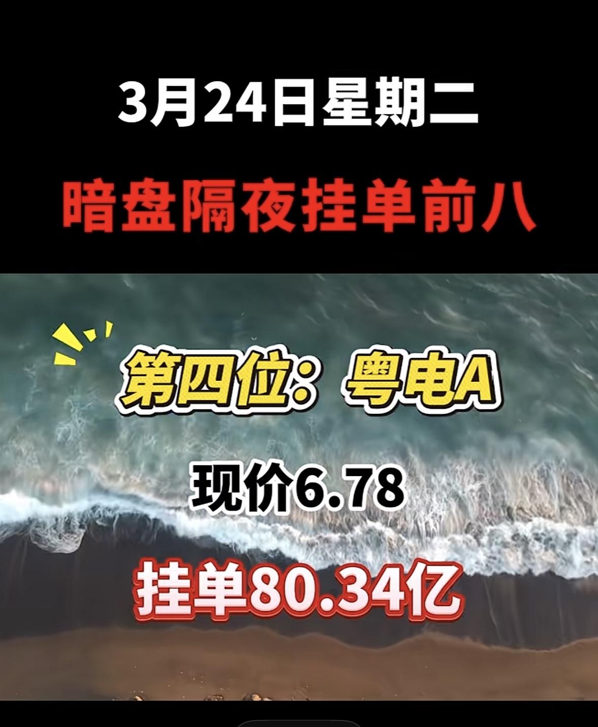 3月25日暗盘隔夜挂单排行榜出炉 华电能源这走势很有看头啊!现价5.59,挂单52.43亿,还是暗盘隔夜挂单前八。这公司名字也是几经变更,从龙电股份到华电能源,中间还经历了*ST华源等。 3月23日暗盘隔夜挂单排名里,华电能源排第二,当时现价5.52,买单84.54亿,卖单16.30亿。和第一名华电辽能比,虽然现价低一点,挂单量也没那么大,但这数据也很亮眼了。看来不少人都盯着华电能源呢,后续走势值得关注,说不定有大行情。