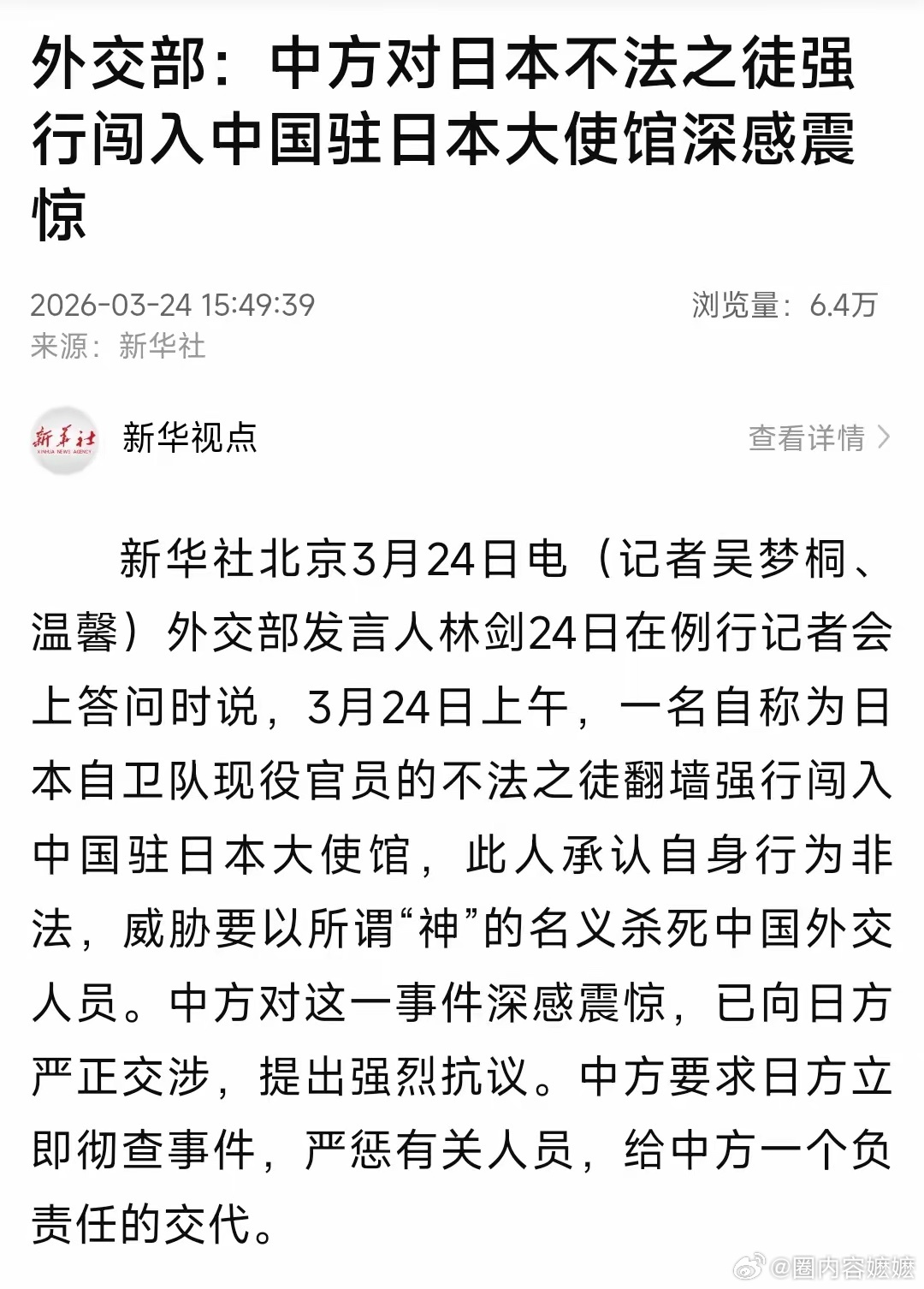 日本 中国作为战胜国,本来有权在日本驻军。这是国际法写清楚的,不是随便说说。1945年发布的波茨坦公告。规定日本必须接受盟国占领,直到彻底销毁战争力量。当时定好,中美英苏四国分区占领日本。中国负责驻守四国岛。当年都准备好了,要派十几万部队过去。目的就是监督日本,防止军国主义死灰复燃。后来因为历史原因,这件事没有做成。现在中国越来越强大。我们有权利,也有责任,维护二战胜利成果。履行当年的国际义务,完全合情合理。有网友说,日本至今没有认真反省历史。有中国在日本驻军,才能更好约束日本。这是对地区和平负责,也是对历史负责。国家强大了,本该属于我们的权利,就要拿回来。小编认为,守住历史底线,才能让老百姓安心,让国家更有底气。对此,你怎么看呢?一日本人威胁要杀中国外交人员
