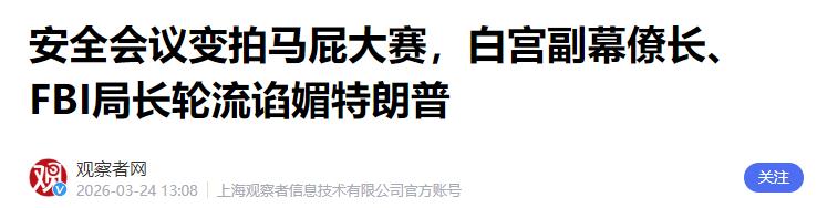 在特朗普的要求下,现场发起拍马屁大赛。 当地时间3月23日,美国前总统特朗普,在田纳西州孟菲斯市,开了一场关于安全主题的公开圆桌会议。 本来这场会议,是要讨论当地的犯罪问题,还有之前特朗普下令成立的孟菲斯安全特别工作组的相关情况,到场的也都是美国的高官,有国防部长赫格塞思、白宫办公厅副主任斯蒂芬·米勒,还有联邦调查局局长卡什·帕特尔等人,场面看着挺严肃。 可谁也没想到,这场严肃的安全圆桌会,最后被特朗普硬生生变成了一场现场拍马屁大赛。 熟悉特朗普的人都知道,他最喜欢听别人吹捧自己,不管是在正式会议上,还是在竞选集会上,都爱听好话,以前他开内阁会议的时候,手下的官员就争先恐后地拍他马屁,把严肃的会议变成了歌功颂德的聚会,这次在孟菲斯,也没例外,而且还是在他的暗示和要求下,现场直接发起了吹捧大赛。 最先站出来吹捧的,是白宫办公厅副主任斯蒂芬·米勒。米勒这个人,追随特朗普快十年了,从2016年特朗普竞选总统的时候,就跟着他做事,是特朗普最信任的亲信之一,平时就经常帮特朗普说话,把特朗普的想法变成文字,还经常在竞选集会上帮特朗普暖场,拍马奉承的功夫早就练得炉火纯青。 在这次圆桌会议上,米勒一开口就没离开吹捧特朗普的话。他当着所有参会人员和现场媒体的面说,孟菲斯能有今天的安全局面,能打击当地的暴力犯罪,全都是特朗普的功劳。 他说,要不是特朗普果断下令,成立孟菲斯安全特别工作组,派遣国民警卫队进驻孟菲斯,当地的犯罪问题根本解决不了,老百姓也没法过上安稳日子。 米勒还说,特朗普是美国历史上最有魄力、最关心民众安全的总统,自从特朗普重返白宫以来,一直把打击犯罪、保护民众安全放在第一位,不管是向孟菲斯派遣国民警卫队,还是计划向芝加哥、圣路易斯等城市派遣执法人员,都是为了让美国变得更安全。 他还强调,自己内心深处的所有想法,都被特朗普表达出来了,能跟着特朗普做事,是他这辈子最大的荣幸。 米勒的吹捧刚结束,联邦调查局局长卡什·帕特尔就紧接着站了出来,继续轮番吹捧,比米勒说得还要直白、还要夸张。 帕特尔是特朗普一手提拔起来的,之前是特朗普的国防部长幕僚长、国家情报副总监,后来被特朗普提名担任联邦调查局局长,成为美国史上首位印度裔FBI局长,能有今天的职位,全靠特朗普的提携,所以他对特朗普格外忠诚,吹捧起来也毫无顾忌。 帕特尔说,联邦调查局能顺利开展工作,能挫败各种恐怖袭击威胁,能调查潜在的犯罪活动,全都是因为有特朗普的正确领导。 他还说,特朗普不仅关心国内的安全问题,在国际上也特别有魄力,不管是对伊朗的强硬态度,还是捍卫美国利益的各种举措,都展现了特朗普作为总统的担当和能力,没有特朗普,美国的安全根本得不到保障。 他还特意提到,自己之所以能担任FBI局长,就是因为特朗普看重他的能力,相信他能做好工作,他一定会尽全力回报特朗普的信任,好好做事,不辜负特朗普的期望。 而且帕特尔还说,特朗普多年来一直为美国民众着想,兑现自己的竞选承诺,这样的总统,值得所有美国人尊敬和拥护。 两人轮番吹捧,你一言我一语,把特朗普夸上了天,现场的气氛也从严肃的安全会议,变成了热闹的拍马屁大赛。 特朗普坐在主位上,听得满脸开心,时不时还点点头,偶尔插一两句话,默许两人的吹捧,看得出来,他对这种场面非常满意,完全没有觉得尴尬。 这次在孟菲斯的圆桌会议上,特朗普暗示手下吹捧自己,米勒和帕特尔作为他的亲信,自然是积极配合,轮番上阵,把一场安全主题的会议,变成了专门吹捧特朗普的现场。 要知道,当时孟菲斯的犯罪问题还没有彻底解决,当地的县长甚至公开表示,不欢迎国民警卫队进驻,认为特朗普的做法是军事化干预,会引起民众的恐慌,但特朗普和他的手下,却完全不顾这些,一门心思搞吹捧。 这场现场发起的拍马屁大赛,看似是手下对特朗普的忠诚,其实背后都是利益的交换。米勒和帕特尔之所以拼命吹捧特朗普,就是因为他们的职位都是特朗普给的,想要保住自己的地位,想要得到更多的提拔,就必须讨好特朗普,顺着特朗普的心意来。 而特朗普之所以喜欢听这些吹捧的话,就是因为他极度自负,喜欢被人仰视、被人恭维,把这种真人秀式的吹捧,当成了自己有能力、有威望的证明。
