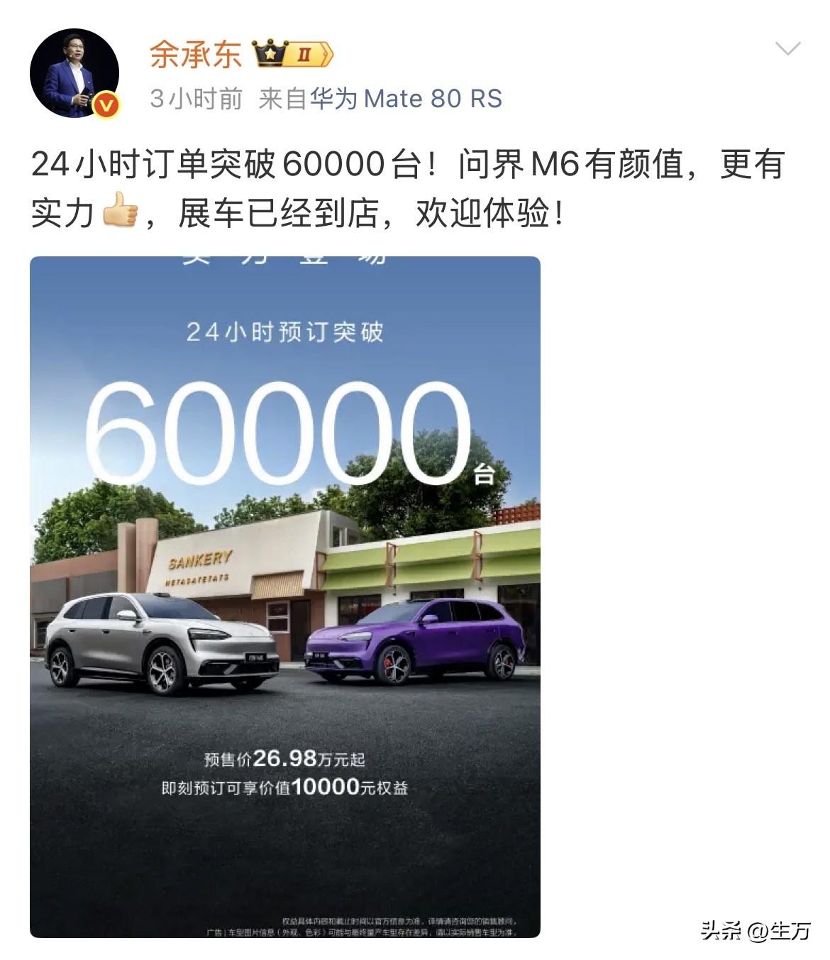 余承东:尚界Z7、Z7T 24小时订单突破25000台! 就在刚才,余承东在社交网络放出了鸿蒙,是新旗下尚界品牌两款新车的订单量,的时间里面这两个新车的订单要突破了25,000台 虽然他没有说是大定还是小定还是锁单,不管怎么样这个入门级别都需要20多万的品牌,能够在一天的时间里面这个数量的订单,在群上说明目标客户还是认可的,毕竟这还不是最终的数字,可能正式发售的时候,估计价格在目前的基础上降一万左右。 而且余承东也表示,接下来的28号,这些刚刚发出来的新车,将以展车的形式,将亮相全国超过23个城市,到时候大家可以去店里面实际的感受一下,看看这些车与之前的版本有什么区别。 因为这一次无论是辅助方面还是硬件方面更新的项目还是比较多,实话实说,价格上面对上一代也不便宜。