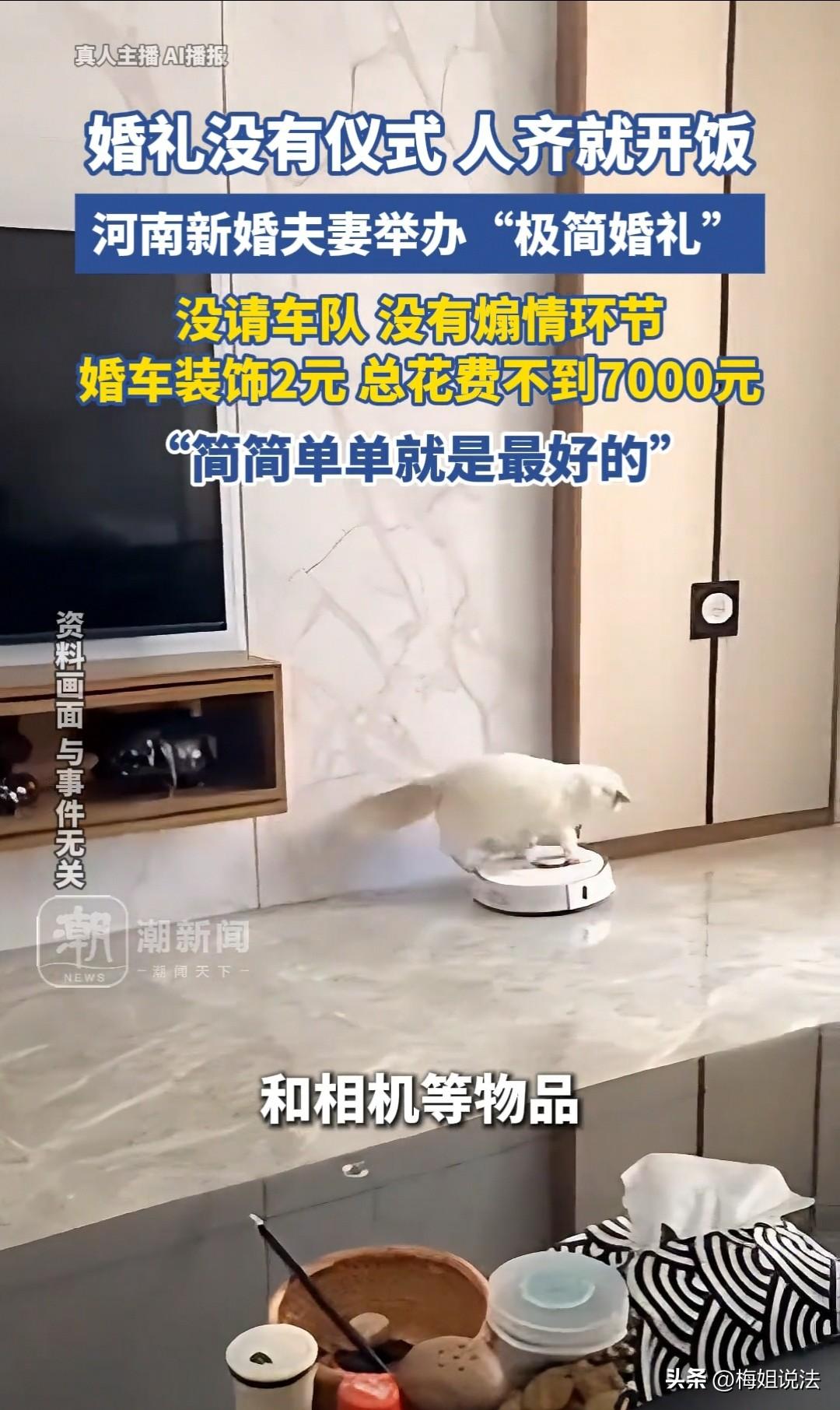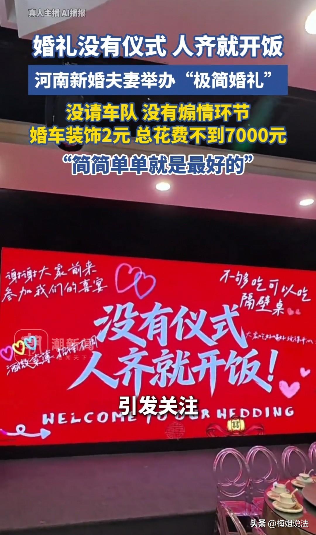 河南,袁先生结婚,婚车装饰花了2元,新娘化妆花了200元,没有豪华车队,一切从简,人到齐了就开饭,前后总共花费不到7000元,最后省下了4万多元,用来买他们喜欢的相机和扫地机器人。 袁先生单膝下跪向女友求婚,对方满脸欢喜地答应了,两人幸福相拥,空气中都飘着甜甜的喜悦。 可接下来筹备结婚的事情,却让这对内向又不喜热闹的小情侣犯了愁。 他们俩性格温和,平时最爱手牵手去郊区散步游玩,偏爱安静自在,一想到婚礼上人群熙攘、流程繁琐,就觉得浑身不自在。 两人也心里透亮,亲朋好友大多是来送上祝福、走个喜庆过场,若是大办特办,又是婚庆又是车队又是煽情环节,到头来感动的只有自己,反而少了最纯粹的快乐。 在他们心里,爱情是两个人的事,幸福也是自己的,不必刻意展示给任何人看,真心相爱,比什么排场都重要。 于是袁先生的女友笑着提议:要不我们的婚礼越简单越好,不请婚庆,不被流程牵着走,不然像木偶一样跟着安排,反倒丢了结婚本该有的开心与自在。 袁先生一听,心里乐开了花!其实他早就这么想,只是怕女友觉得自己舍不得花钱,一直没敢开口。 如今女友主动提出,简直心意相通,他立刻满心欢喜地答应下来。 虽说一切从简,接亲还是要有的,袁先生笑着问女友:婚车要安排几辆车组成车队呀? 女友俏皮又爽快地回答:一辆就够啦,把我开开心心接去酒店就行,要什么车队呢! 没有婚庆,没有伴郎伴娘,车队自然也没必要。婚车也不用大费周章装饰,花几块钱弄点喜庆绸缎,系在反光镜上,热闹又好看,还不浪费。 袁先生笑着说,是不是太简单啦?女友却一脸通透:那些花哨装饰没人细看,费钱又费力,简简单单才最舒心。 看着如此志同道合的爱人,袁先生满心甜蜜,第二天一早只花2元钱,把婚车装饰得喜气又简约,欢欢喜喜去接他的新娘。 新娘也格外轻松,花200元简单化个妆、做个发型,穿着日常舒服的衣服,没有华丽婚纱,却笑得比谁都灿烂,自在又幸福。 亲朋好友到场一看都愣住了,了解缘由后,纷纷竖起大拇指,满脸赞许——现在这般通透又快乐的年轻人,真的太难得! 大家本就是欢聚一堂送祝福,婚宴必不可少,那些繁琐形式反而可有可无。袁先生和妻子看透这一点,让整场婚礼都充满轻松与欢喜。 仪式上,两人笑着走上台,没有敬茶红包,没有煽情台词,袁先生拿起话筒,乐呵呵一句:人到齐啦,咱们开饭! 全场瞬间哄堂大笑,掌声不断,这样真诚又欢乐的场面,才是亲朋好友最想要的团圆与祝福。 会场里喜庆的音乐轻轻响起,温馨又甜蜜,把幸福氛围拉满。 原来,最简单的仪式,藏着最动人的幸福。 袁先生算了算,婚礼只筹备二十几天,全程轻松又愉快,总花费不到7000元,亲朋好友满意,小两口更是舒心至极。 省下的几万元,他们打算买心心念念的相机,周末一起去郊游拍照,记录美好时光;再添一台扫地机器人,减轻家务,把日子过得更惬意自在。 网友们纷纷赞叹:这对小夫妻太会生活了!不拼排面、不随大流,怎么开心怎么来,随性又幸福,这样的婚礼,才最让人羡慕! 从法律角度来看,这场快乐又简约的婚礼,不仅暖心又实在,还完全符合法律规定,真的太让人欢喜啦! 《民法典》第一千零四十六条明确规定:结婚应当男女双方完全自愿,禁止任何一方对另一方加以强迫,禁止任何组织或者个人加以干涉。 袁先生和妻子按照自己的心意选择极简婚礼,不被世俗排场绑架,不被繁琐流程左右,正是在光明正大地行使婚姻自由权,法律全力支持、全力保护! 《民法典》第一千零五十三条、第一千零五十七条也倡导文明、节俭、自愿、平等的婚恋新风,反对铺张浪费、盲目攀比。 他们不搞大排场、不花冤枉钱,把钱用在自己的小日子上,既不违背任何法律规定,又契合新时代文明婚嫁的公序良俗,简直是法律都要点赞的幸福模样! 只要依法登记结婚,两个人真心相爱、彼此自愿,婚礼怎么简单、怎么开心,法律都站在他们这边!这样的婚礼,合法、合理、更合心意! 对于此事,大家如何看? 素材来源于潮新闻