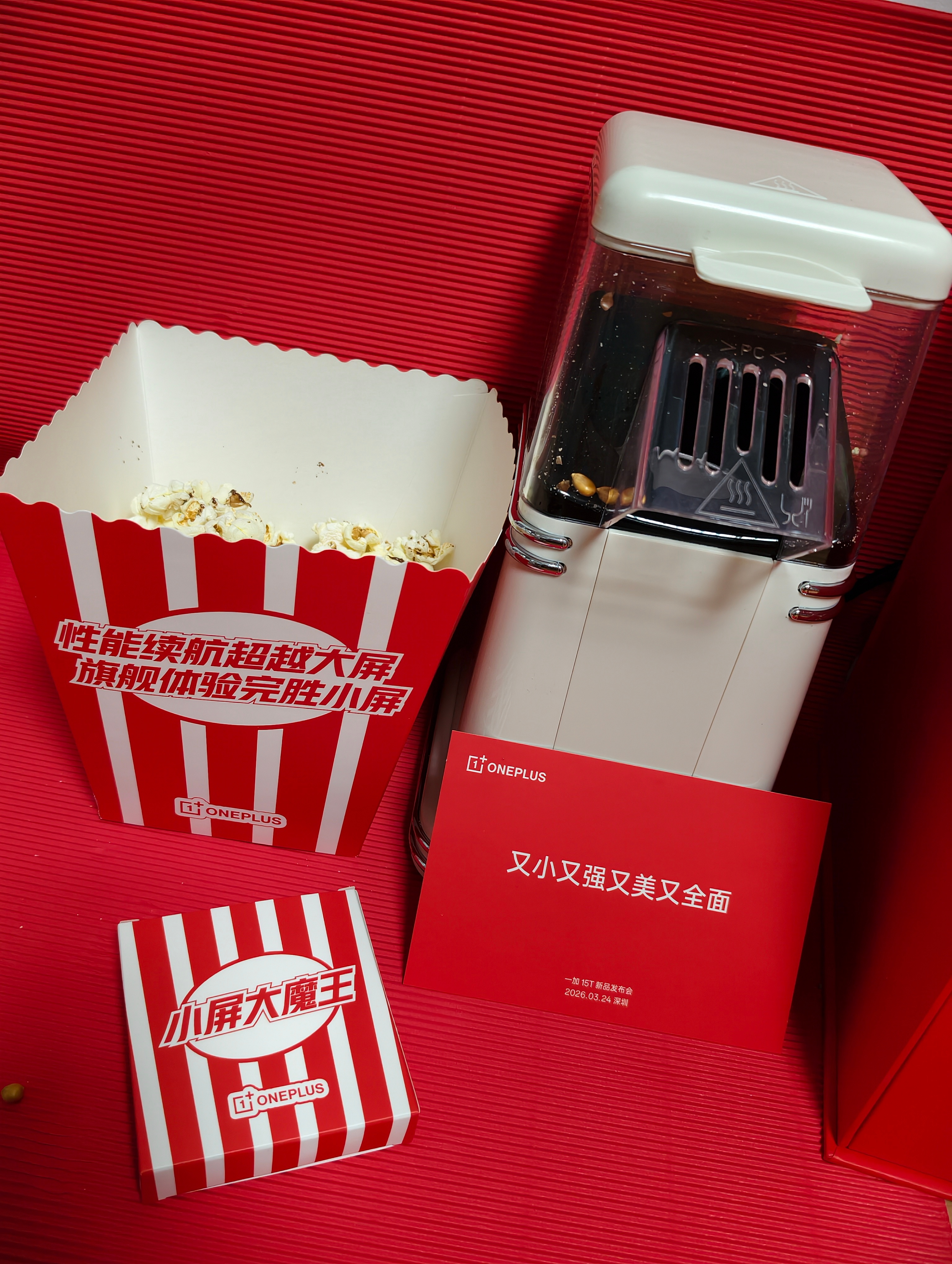 今天一加15T发布,之前的邀请函是个小小的爆米花机,又小又美又强又全面,小屏幕手