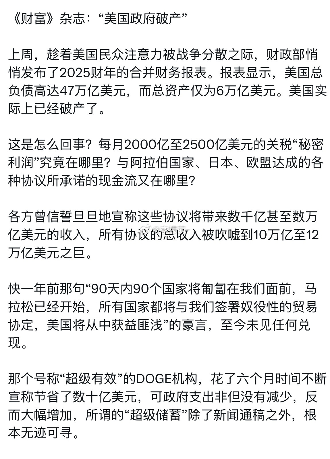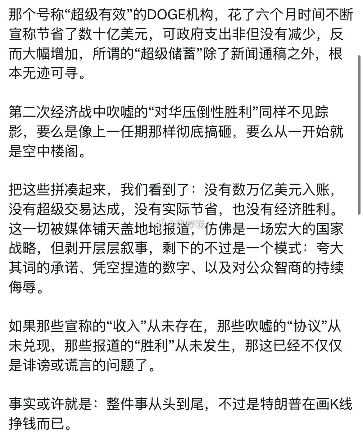 《财富》杂志:美国没有数万亿美元入账,没有超级交易达成,没有实际节省,也没有经济胜利。这一切被媒体铺天盖地地报道,仿佛是一场宏大的国家战略,但剥开层层叙事,剩下的不过是一个模式:夸大其词的承诺、凭空捏造的数字、以及对公众智商的持续侮辱。