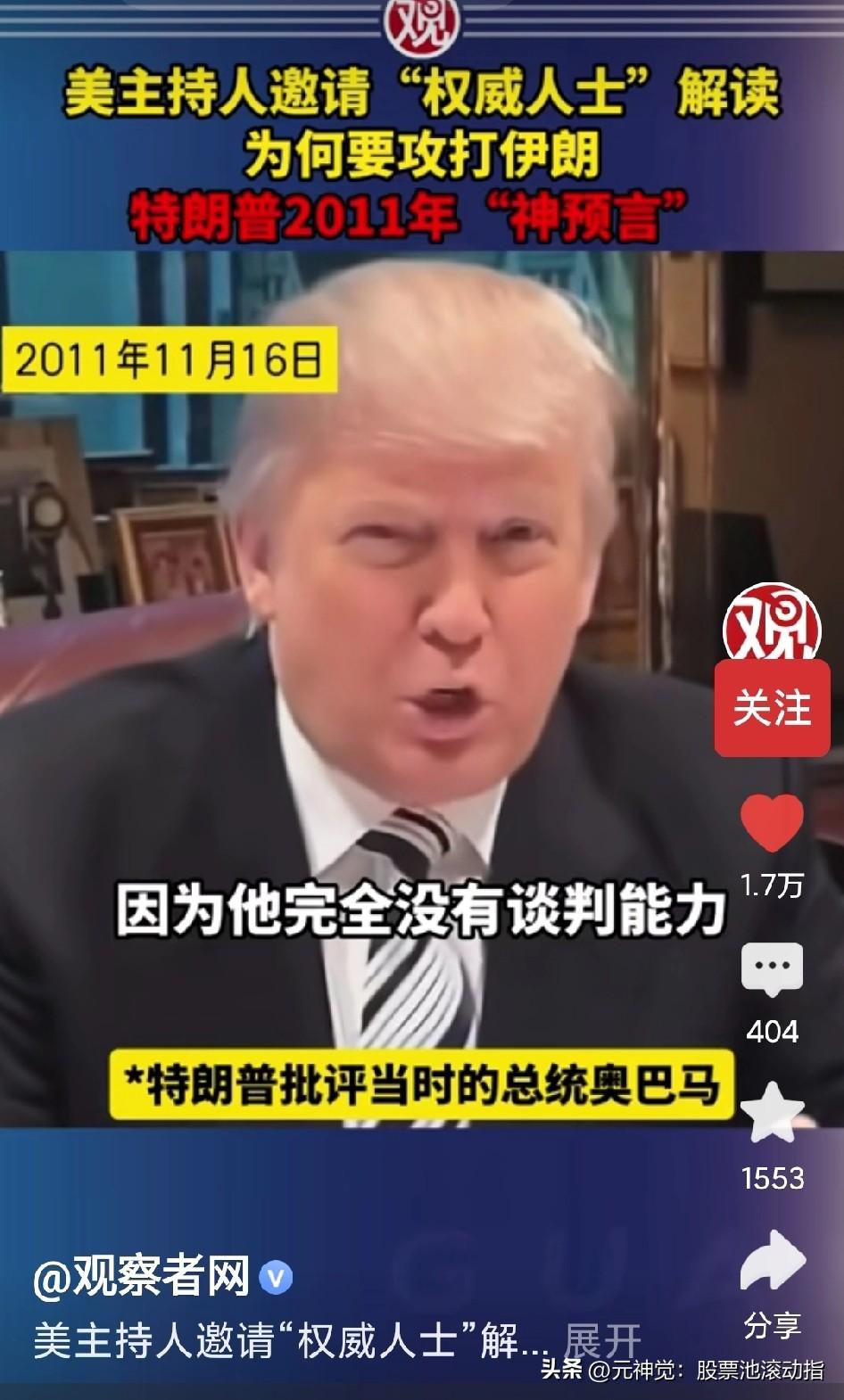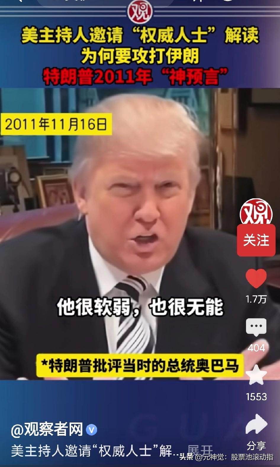 特朗普15年前关于攻打伊朗的神预言:“我们的总统(奥巴马)一定会和伊朗开战,因为他完全没有判断能力;很软弱,也很无能(会被犹太资本绑架)。”
