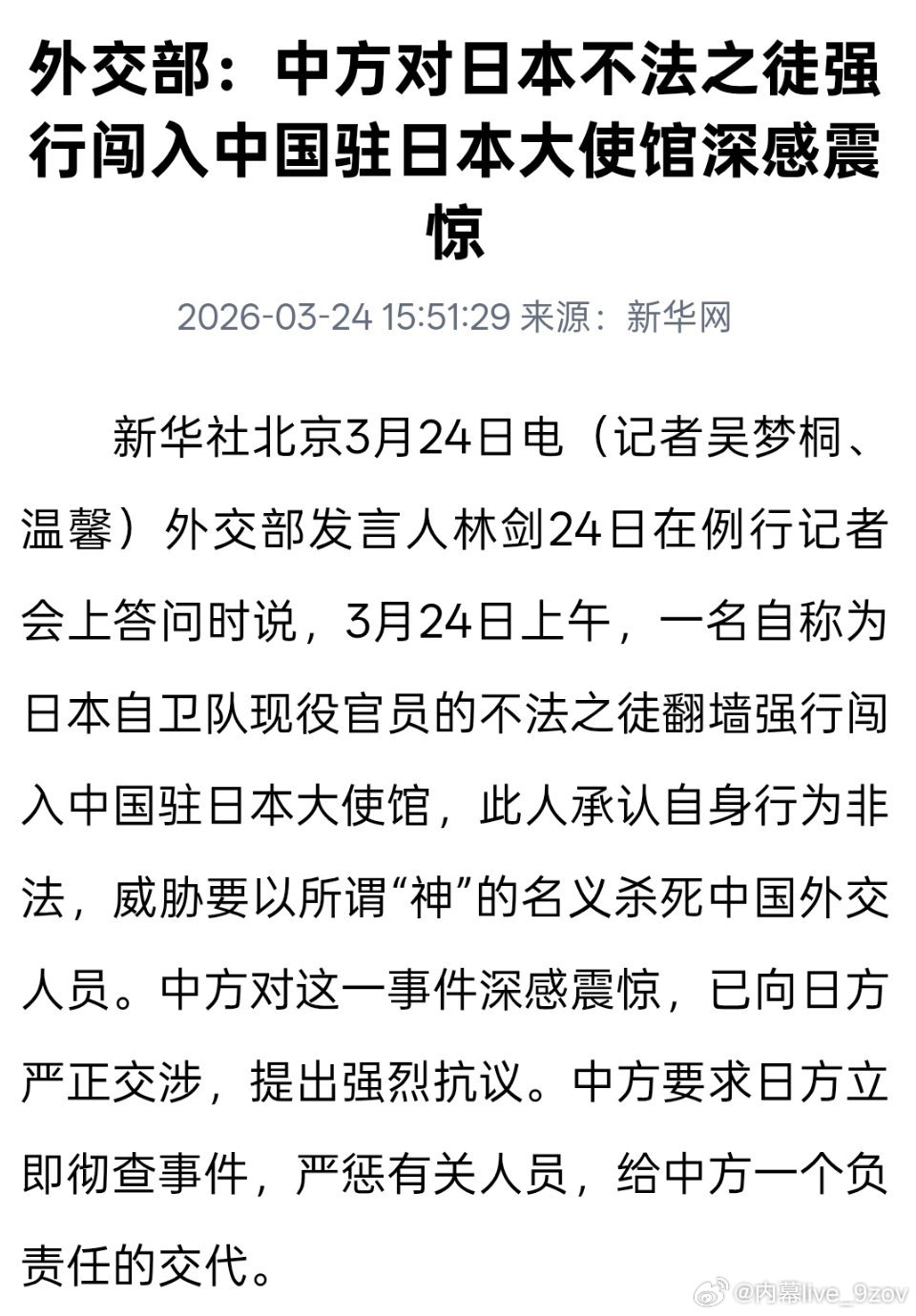 我外交部发言人当天在记者会上表示,此人承认自身行为非法,威胁要以所谓“神”的名义杀死中国外交人员。中方对这一事件深感震惊,已向日方严正交涉,提出强烈抗议。中方要求日方立即彻查事件,严惩有关人员,给中方一个负责任的交代。
