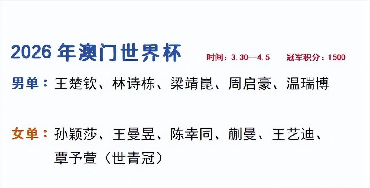 倒计时6天!国乒天团即将集结澳门世界杯,这场乒乓盛宴谁能错过! 赛事系列:2026年国际乒联男子及女子单打世界杯 赛事时间:3月30日-4月5日 赛事地点:澳门 参赛人数:男女单打各48名选手参赛 国乒阵容: 男单:王楚钦、林诗栋、梁靖崑、周启豪、温瑞博 女单:孙颖莎、王曼昱、陈幸同、蒯曼、王艺迪、覃予萱 赛制:小组赛五局三胜制,淘汰赛七局四胜制。 🔥 优酷的这张海报,排版简直是满分!不仅人没有被p的失真,站位也是很妙! 视觉中心稳稳锁定王楚钦×孙颖莎这对现役核心双子星,谁看了不喊一句「合体天下无敌,分则各自为王」! 后方依次排布国乒男女队其他核心选手,层层递进的构图,既有团队感又突出重点,排版满分! 配色也蛮讲究,蓝紫色渐变背景+动感线条,把赛场的紧张感和热血感都拉满,不愧是热血乒乓!