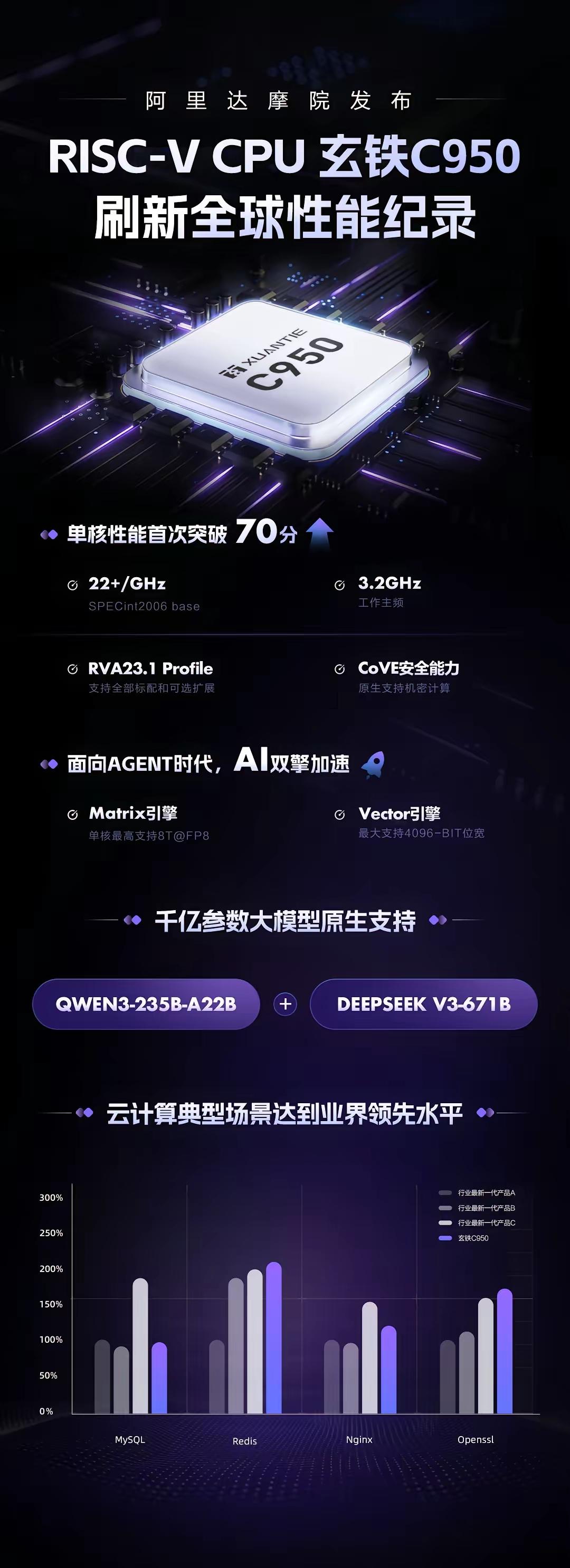 科技圈彻底炸了!国产CPU凭开源架构直接登顶,这波逆袭来得太突然! 3月24日上海玄铁RISC-V生态大会,阿里达摩院亮出玄铁C950,一举拿下全球RISC-V性能榜首,打破了外界对开源架构只能做低端芯片的偏见。主频3.2GHz,SPECint2006单核破70,性能直追主流服务器芯片,用硬实力证明开源路线同样能冲击高端算力市场。 比起单纯的性能突破,更有价值的是我们掌握了架构主导权,不用再被闭源生态卡脖子。玄铁多年深耕社区、持续迭代架构,走出了一条自主可控的新路,这才是芯片突围的关键。 未来RISC-V势必形成三足鼎立之势,中国团队站在了赛道最前端。 你觉得这款芯片会带动国产服务器与AI算力全面提速吗?