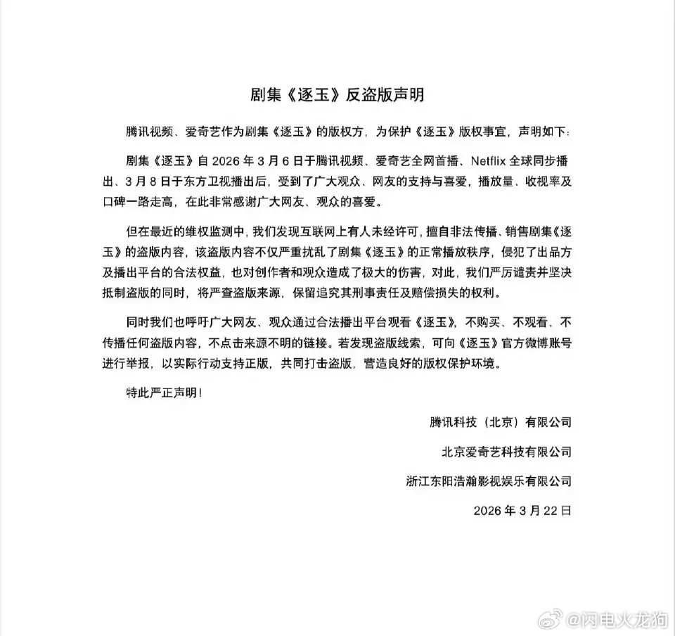 腾讯 爱奇艺 联合声明了,《逐玉》大结局泄露根本不是炒作,片方没这么傻,这部剧虽然口碑褒贬不一,热度也还是有的。平台都等着最后几集超点赚钱呢,不可能把原片放出来砸自己。至于原片为什么会泄露,目前还不知道,两大平台要追究刑事责,闹大了。