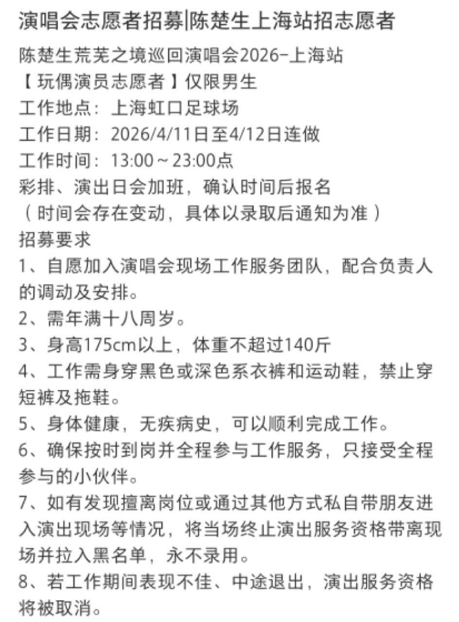 陈楚生演唱会招募志愿者,不是要扮演这个大六毛吧[捂脸]! 要求好严格,身高1.75以上,体重140斤以内,嗯,六毛也是个大帅哥。很挑剔的[笑哭]! 我就是好好奇,六毛这一身玩偶服穿上,从哪里能看到舞台?六毛的眼睛好小啊[捂脸]! 这个工作也是很辛苦的,要穿着玩偶服站立好几个小时,又闷又热! 最大的好处就是参与感,非常值得回忆的经历,有条件的小伙伴们冲吧!