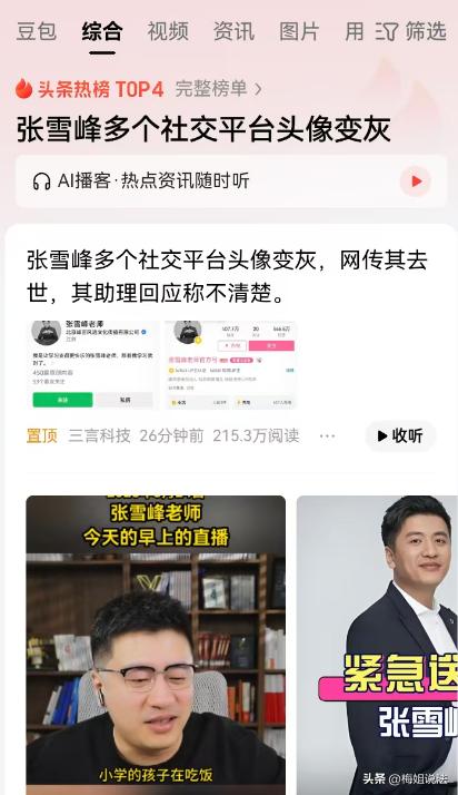 江苏苏州,张雪峰B站、小红书等平台头像均增加了灰色滤镜,还登上了今日头条的热榜第