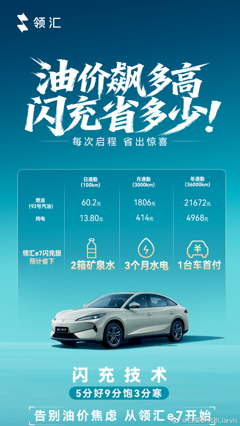 就按一年跑1.5万公里算,燃油车的油费加保养,一年下来上万肯定有了。你再看看领汇e7,如果是家充的话,就几分钱一公里;天天闪充的话折算下来也就一两毛一公里,而且纯电车的保养次数和保养项目都大大少于燃油车。这还只是一年,如果把时间轴拉长到3年、5年来看,这全生命周期的总成本都要差出一台车了。所以如果选择领汇e7,又能享受闪充的便利,也确实能省下很多预算,去享受更高品质的生活。大家觉得这笔账算得划算不?大v聊车领汇e7领汇e7搭载闪充技术领汇e7最具性价比闪充车型