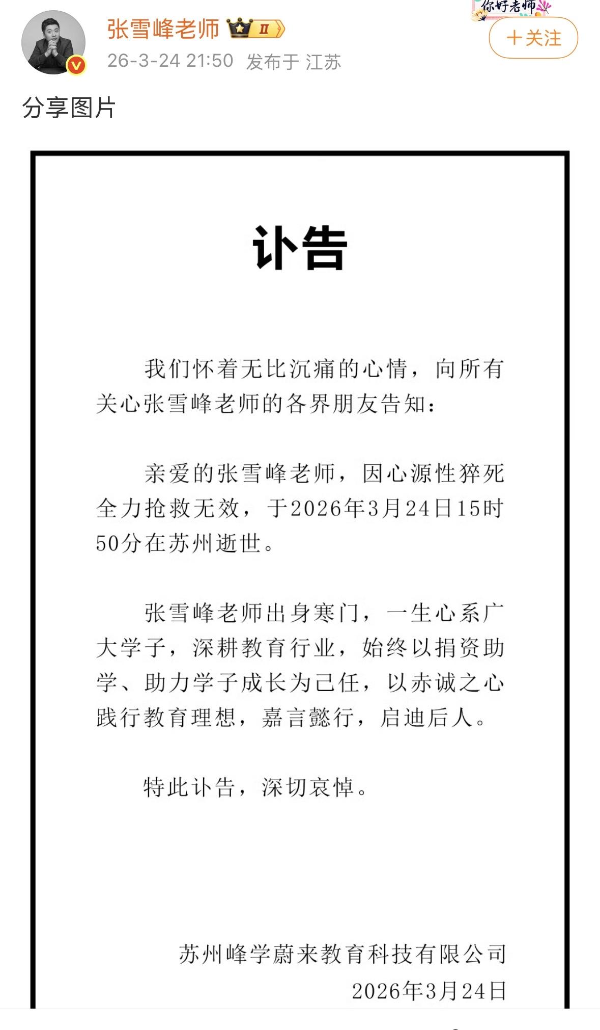 张雪峰已去世7小时,3.24,15:50,41岁,出身寒门,鼎盛之年,命运无情,猝死逝世。他出生于齐齐哈尔,心系广大学子,曾为很多同为寒门出身的学子指明求学就业方向。也曾陷入争议,因为“实用主义”过盛,因为太敢说太现实。 刚过不惑之年,好不容易拼到今天,到底,还是败给了心源性猝死。他有日常锻炼,坚持长跑,但这些努力或许无法弥补心理压力和工作强度的致命损伤。