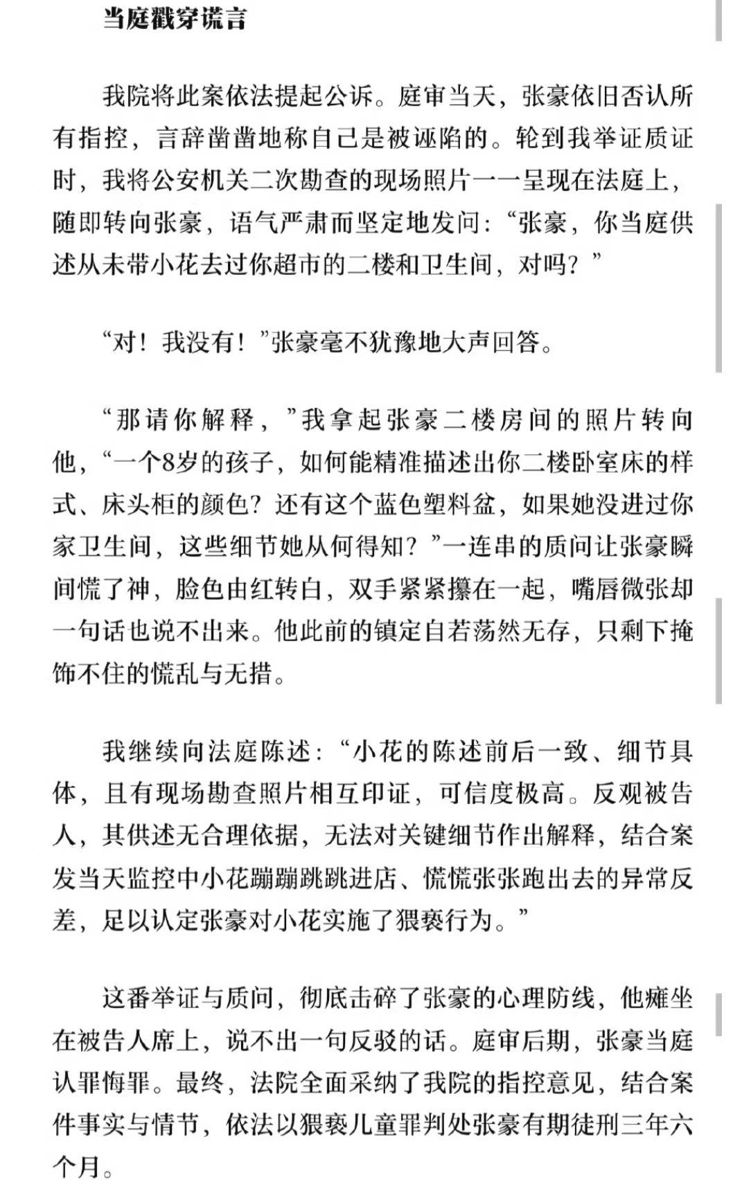8岁的女孩独自去小区烟酒超市购买零食,竟然被猥亵了。 女孩妈妈带着女孩到派出所报警后。 通过DNA鉴定结果显示没有超市老板的生物痕迹。 问题大了,没有证据。 超市老板解释说女孩在店里偷东西,被抓到后,害怕跑了,报警就是为了报复。 能信吗?女孩为什么报复?如果是偷东西被抓,孩子回家后,更不敢和家长说吧!更别说报警报复了。 没有目击证人,没有直接证据,超市老板拒不承认,还反咬一口。 真是哑巴吃黄连,有口说不出。 好在女孩接受询问时,能够准确的说出事情经过,说出超市二楼具体陈设(超市老板接受询问时,否定女孩去过二楼)。 最终法院以猥亵儿童罪判处被告有期徒刑3年半。 女童猥亵案 春日生活打卡季