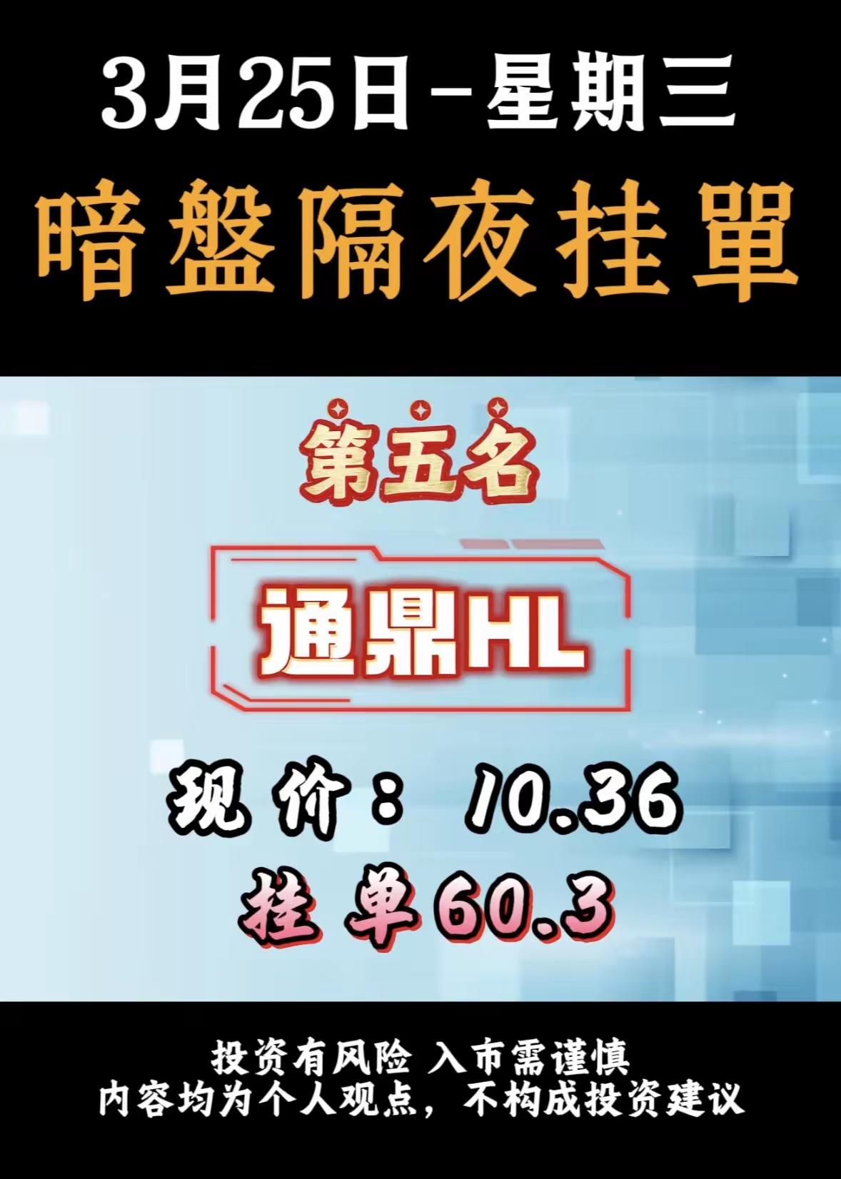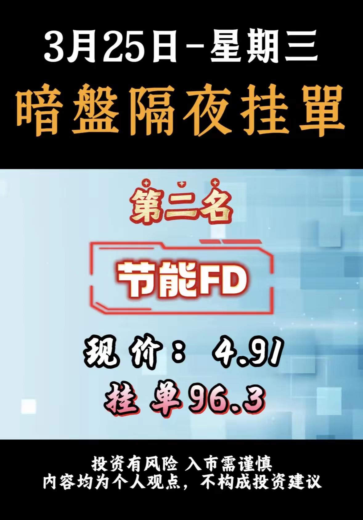 3月25日暗盘隔夜挂单解析📊 3月25日暗盘隔夜挂单热度集中,整体呈现高景气赛道偏好特征。 金开XN以102.3的挂单量居首,现价11.07元,资金关注度最高;节能FD、银河DZ紧随其后,挂单量分别为96.3、81.2,均维持高位,显示市场对相关标的的强烈预期。 从挂单规模看,前六名挂单量均超50,其中前四名突破70,反映出资金对这些标的的集中布局意愿。 结合此前3月24日暗盘资金流向,节能FD延续了前期资金流入的热度,而金开XN、银河DZ等新面孔跻身前列,或反映资金轮动至新的潜力方向。 需注意,此类数据仅为隔夜挂单参考,不构成投资建议,实际交易仍需结合盘面走势与基本面综合判断!!!股市分析