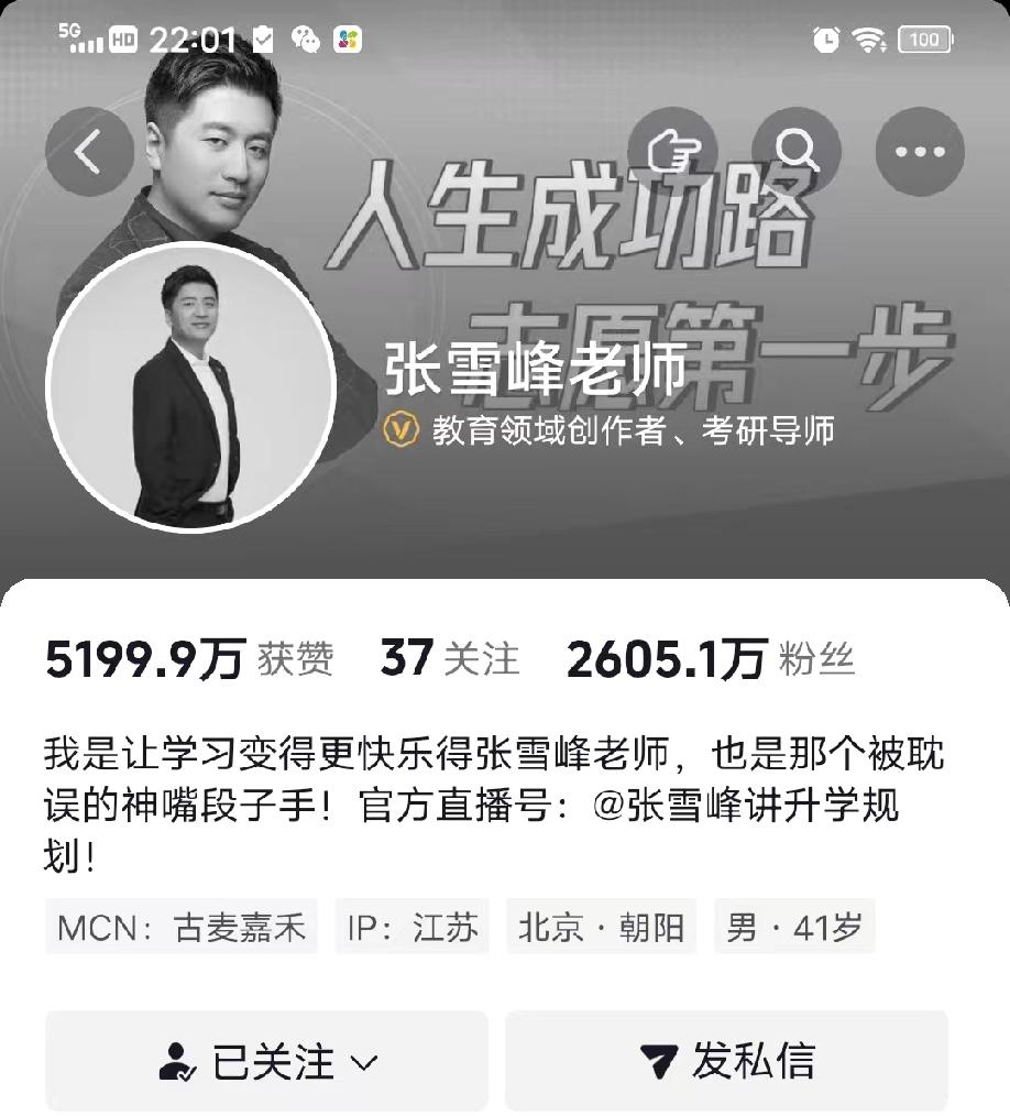 张雪峰个人账号一小时涨粉8.5万,图一是9:03分的截图,图二是10:01分的截图,目前还在以每分钟约1000人的速度增长,或许这就是他们对张雪峰老师的一种思念方式吧!愿天堂没有病痛,张老师一路走好!