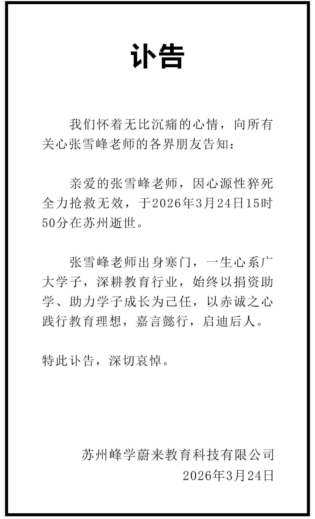张雪峰公司发布讣告所以说人有时候话也不能乱说……其实张雪峰老师人真的挺好的,这世