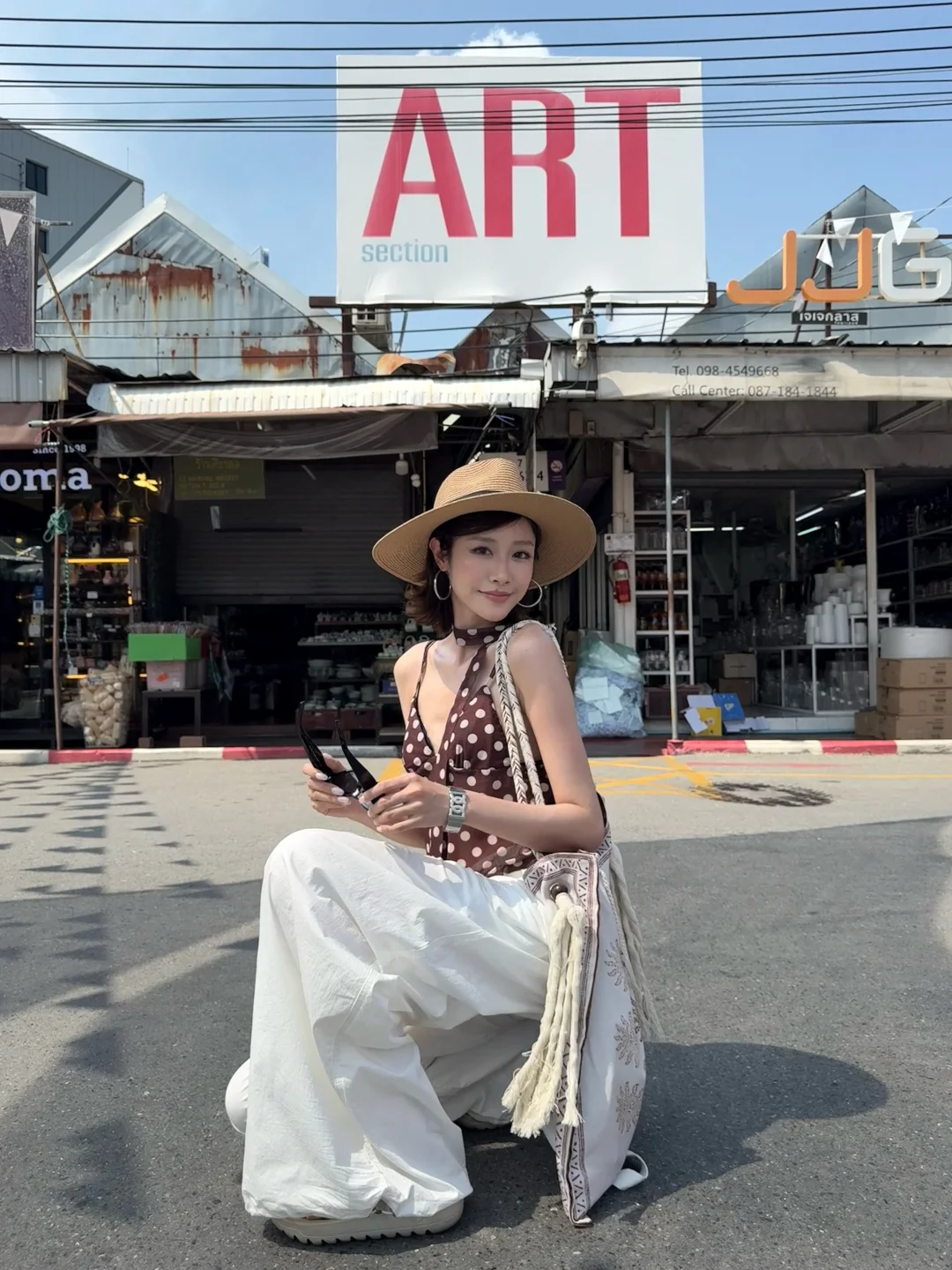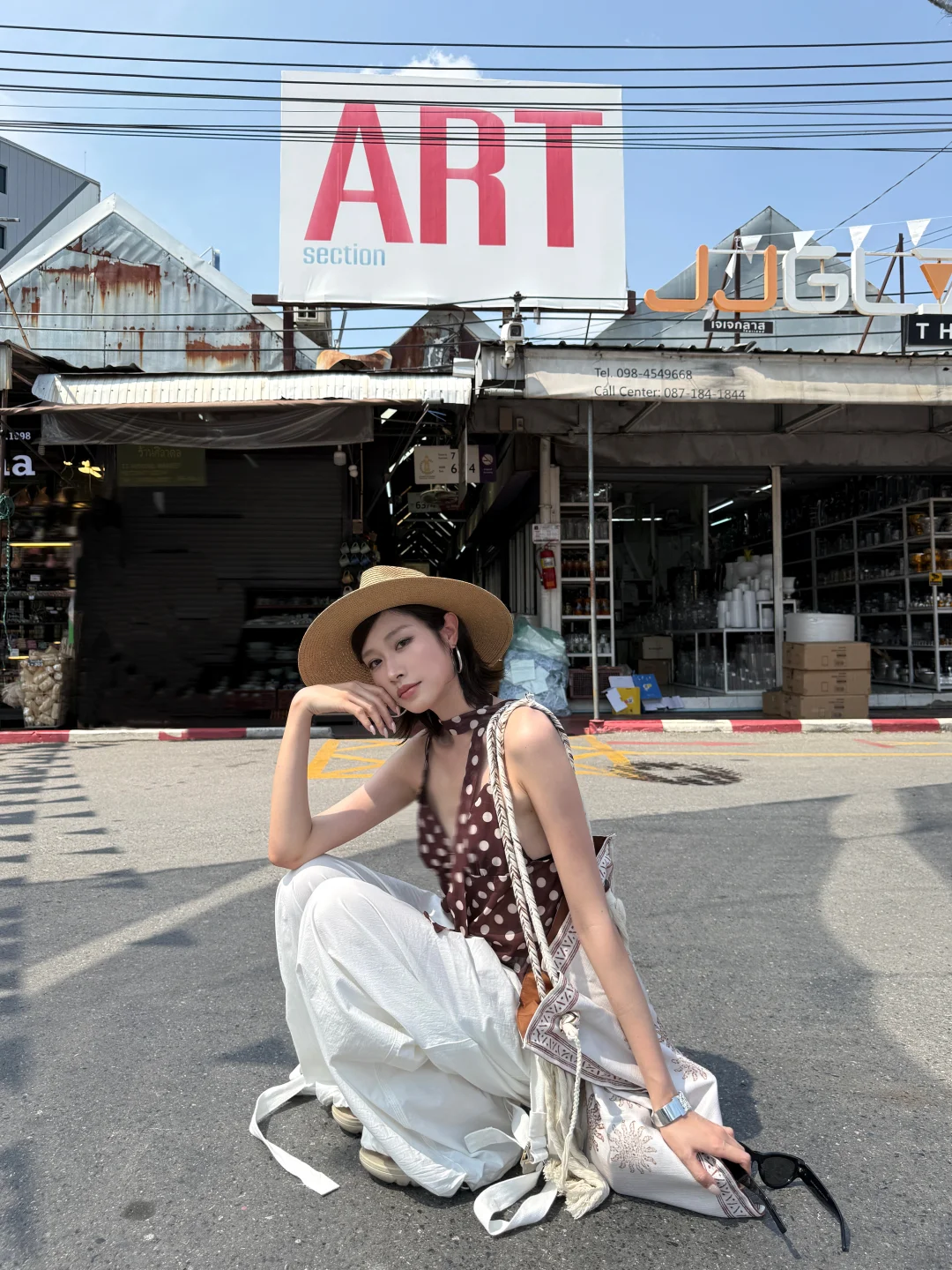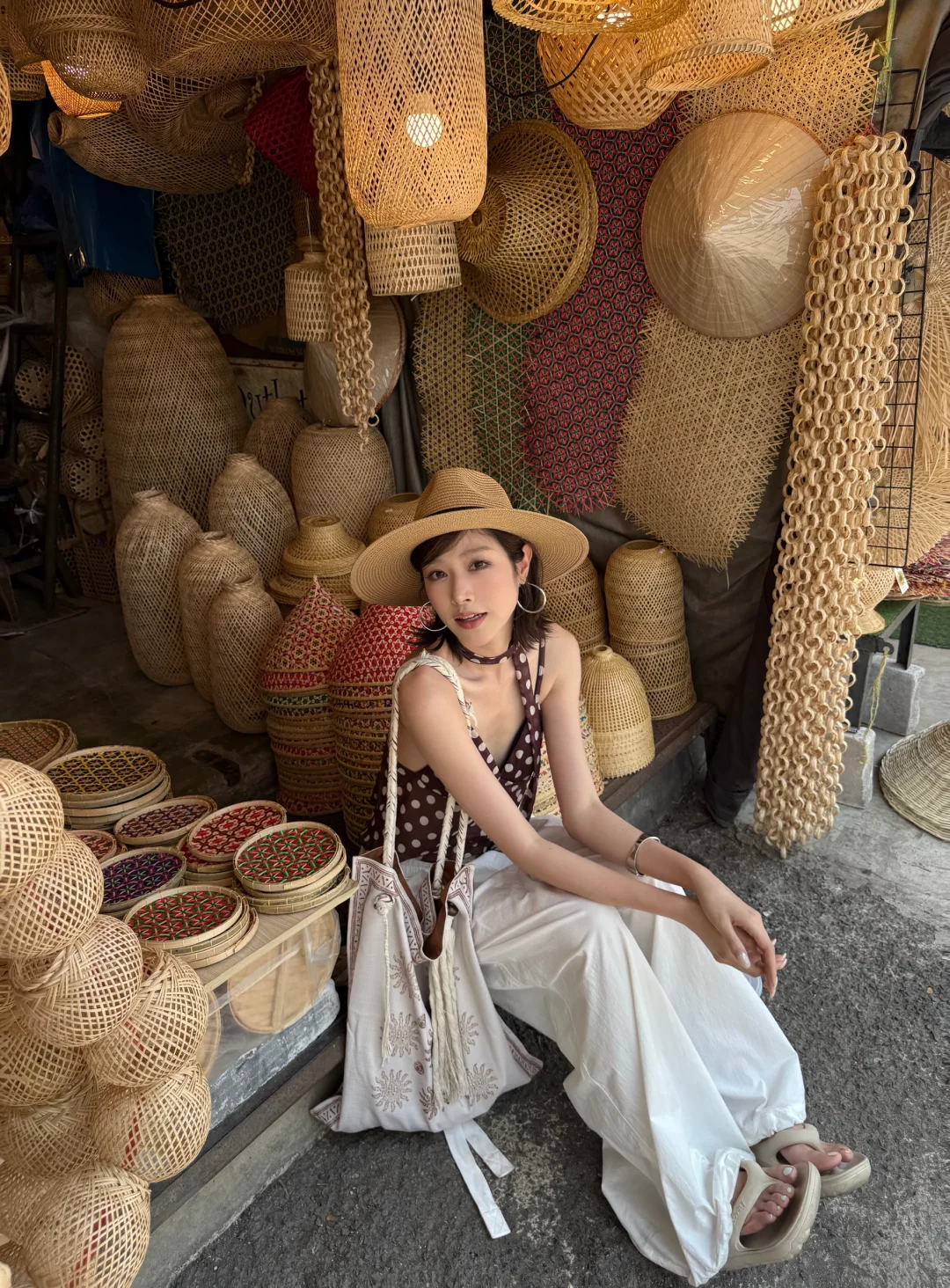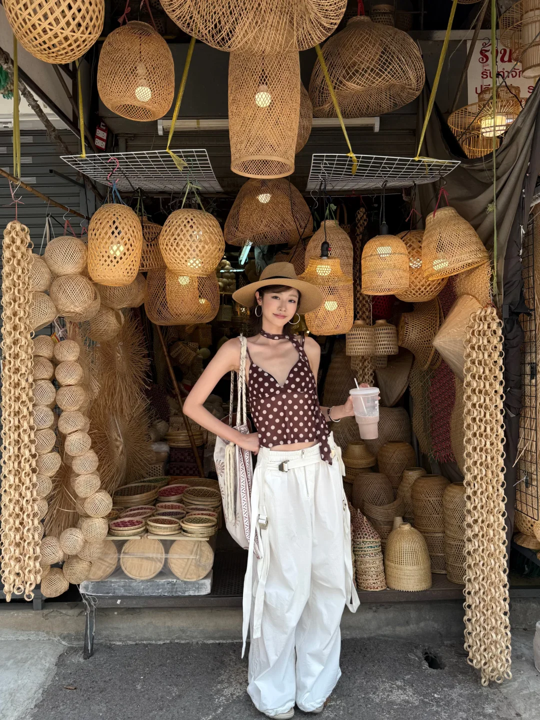 泰兰德 曼谷 乍都乍周末市場 旅行穿搭 ootd 度假穿搭 夏日穿搭 穿搭灵感 波点吊带 百搭长裤