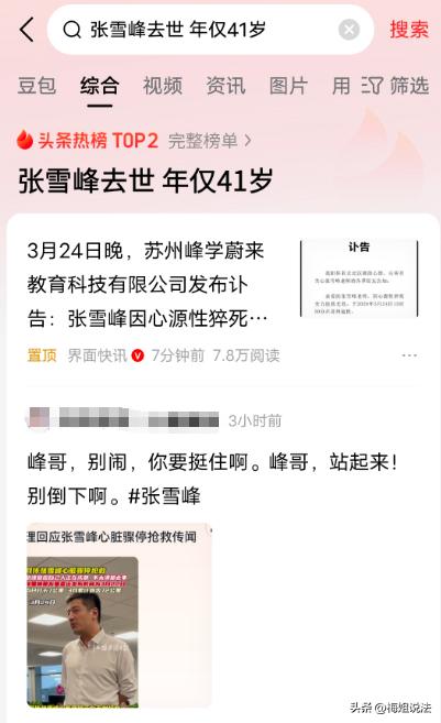 江苏苏州,张雪峰去世,年仅41岁! 信息来源:界面新闻、 3月24日,一则讣