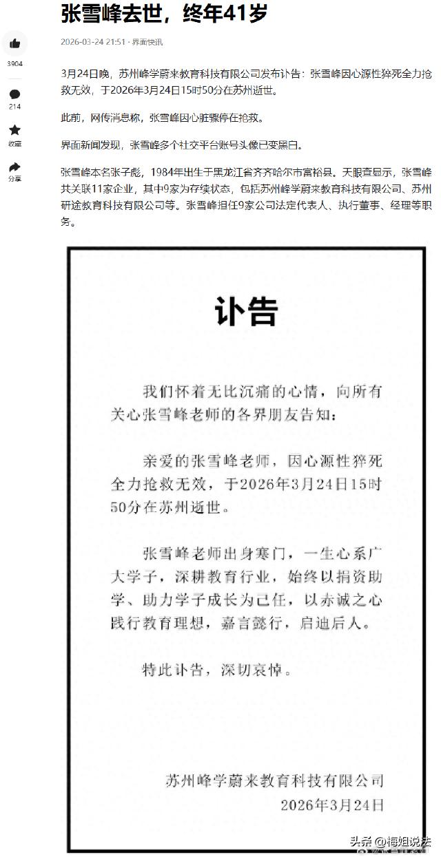 江苏苏州,张雪峰去世,年仅41岁! 信息来源:界面新闻、 3月24日,一则讣告划破平静,张雪峰先生因心源性猝死抢救无效离世,留给世人无尽的惋惜与怀念。 社交平台上那一张张黑白头像,不仅是对他的深切哀悼,更镌刻着他一生的热忱与坚守,从寒门学子到教育深耕者,他用奋斗书写了平凡人生的不凡篇章。 生于黑龙江齐齐哈尔的普通家庭,张雪峰没有与生俱来的光环,却凭借不服输的韧劲,走出了属于自己的道路。 从最初走上讲台备受打击,到反复打磨课件、深耕升学规划领域,他用真诚与专业,打破了教育信息的壁垒,为无数普通家庭的孩子点亮了前行的灯。 他曾说,学习是老实人家孩子唯一的出路,这份清醒的认知,藏着他对寒门学子的共情与期许。 他的一生,是奋斗的一生,更是温暖的一生。 作为9家企业的掌舵人,他在商业领域稳步前行,却从未忘记初心,每年坚持捐赠善款,助力贫困儿童圆求学梦想,用行动诠释着企业家的责任与担当。 他的言论或许曾引发争议,但背后始终是对学子未来的关切,是希望每个人都能通过正确的选择,少走弯路、实现价值。 生命的长度有限,但厚度无限。 张雪峰先生用一生告诉我们,出身无法决定命运,奋斗可以改变轨迹;平凡的人,只要心怀热爱、坚守初心,也能发出照亮他人的微光。 那些他普及的升学知识,那些他传递的奋斗理念,那些他留存的善意,终将成为无数人前行路上的力量。 逝者安息,精神永存。 愿我们铭记张雪峰先生的坚守与热忱,带着他的期许,脚踏实地、向阳生长,不负时光、不负自己,用奋斗书写属于自己的人生华章,把这份温暖与力量永远传递下去。 张雪峰去世 年仅41岁