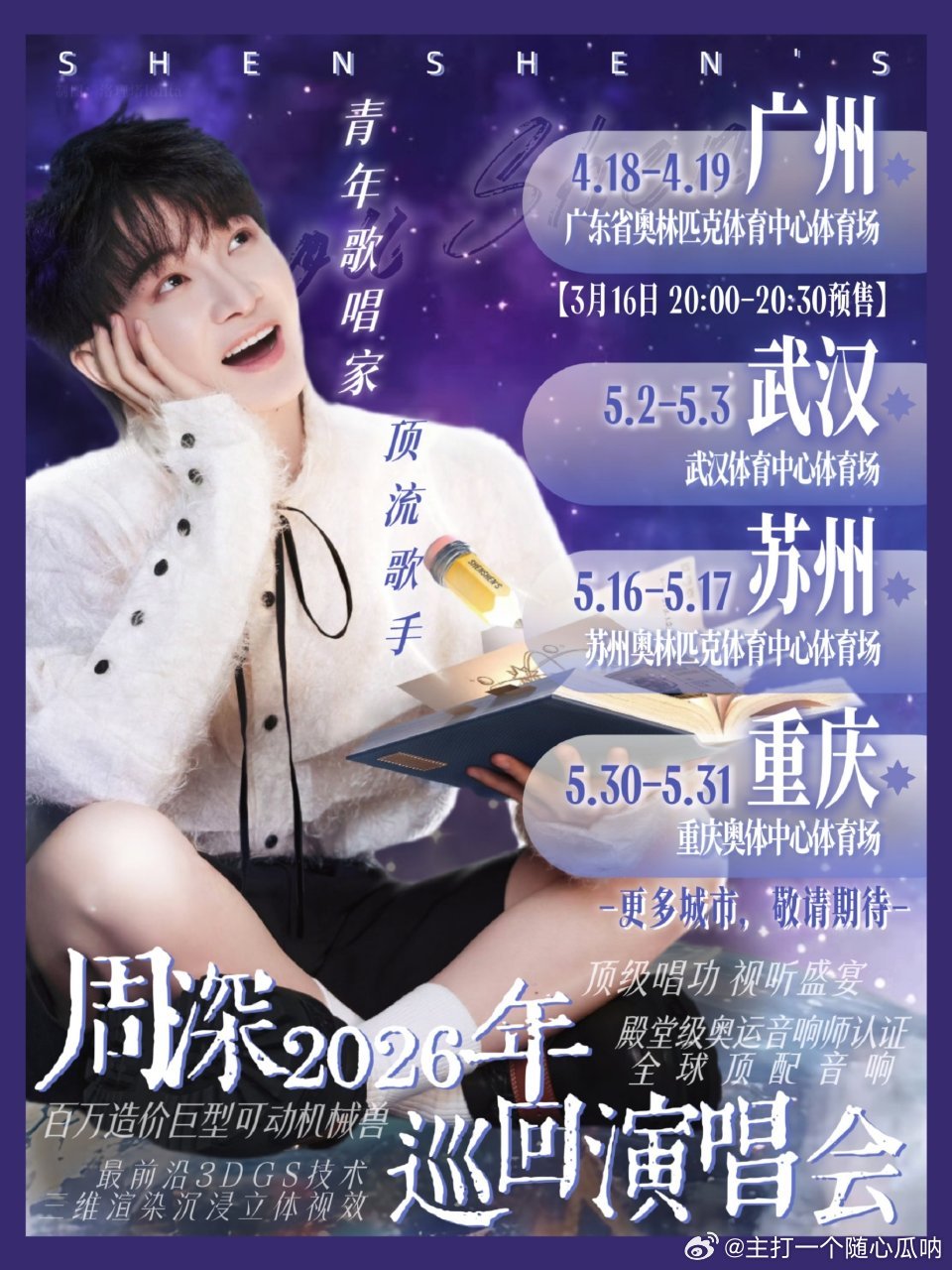周深3月已官宣电视剧《我的山与海》主题曲《背着山的人》、电影《挽救计划》中文主题曲《修星星的人》、3月25日《白日提灯》OST、《王者荣耀世界》开服主题曲,3月27日阅文IP盛典上首唱全新庆贺主题曲!不愧是百变风格的国民大歌手周深,歌曲出品保质又保量还有2026年巡回演唱会开唱在即,都有票了吗