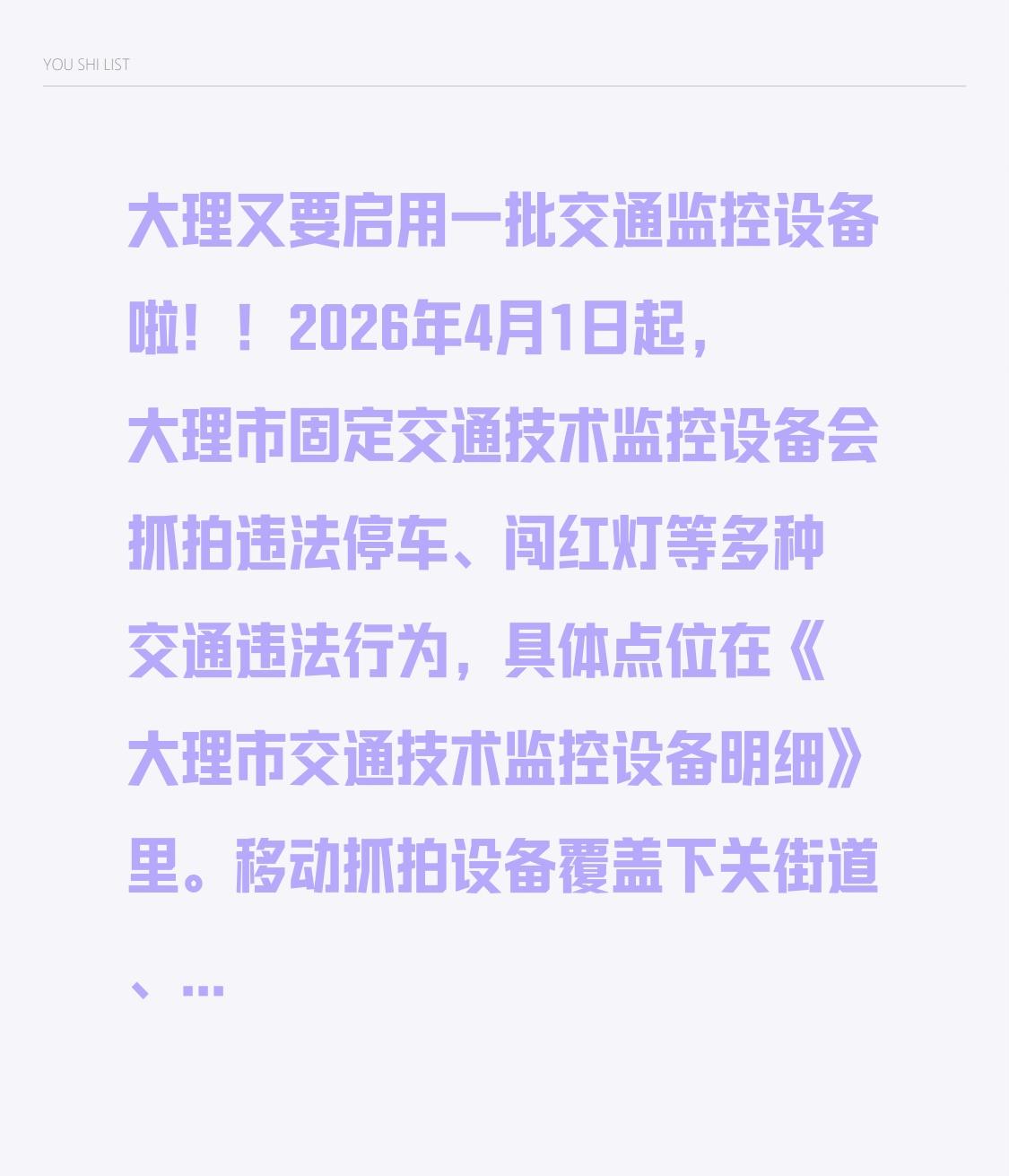 大理又要启用一批交通监控设备啦!! 2026年4月1日起,大理市固定交通技术监控设备会抓拍违法停车、闯红灯等多种交通违法行为,具体点位在《大理市交通技术监控设备明细》里。移动抓拍设备覆盖下关街道、太和街道等区域。 另外,早在去年8月15日零时起,大理州就已在辖区高速公路启用交通技术监控设备,对违法车辆拍摄取证并处罚。 这些举措是为规范交通秩序、减少事故。开车的朋友们可得注意了,别因为一时疏忽被抓拍受罚,遵守交规才能一路平安。