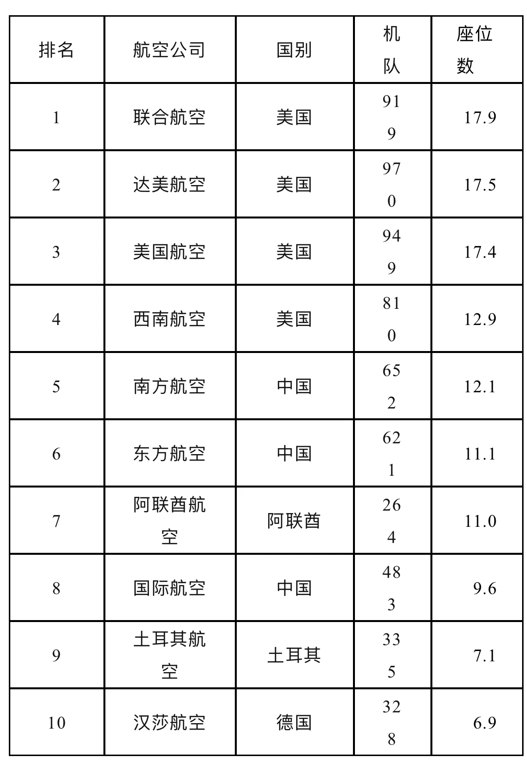 从上述数字可以看出,全球飞机座位数最多的十家航空公司中: