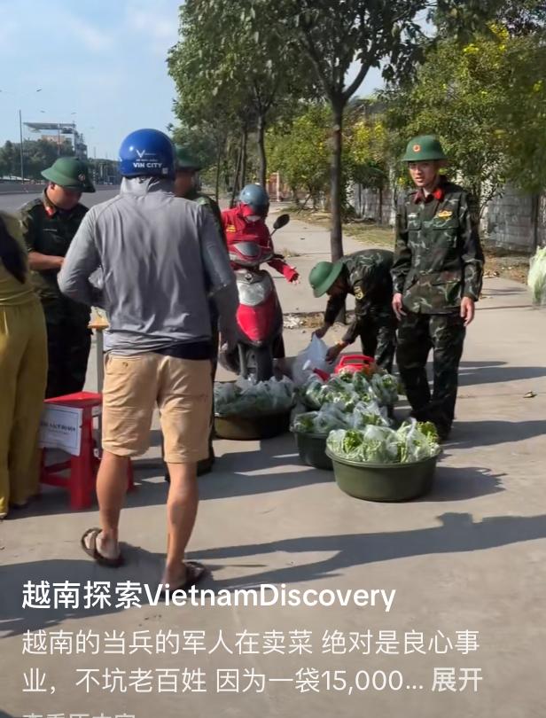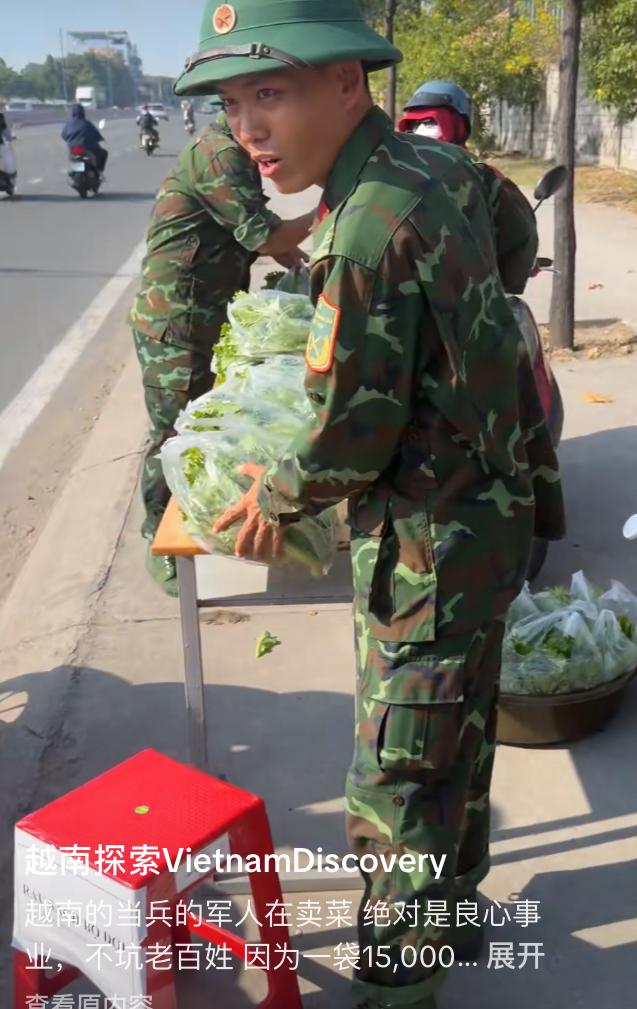 越南军人在军队门口卖蔬菜。 台湾省网友拍摄到越南军队门口,竟然有一群越南军人在卖菜,一袋是15000越南盾,八块多人民币,不过在他们那边,军人从商是不违法的,所以很多越南军人都会有其他的副业 战后的时候,越南穷的养不起军队只能鼓励他们自己挣钱养活自己,所以这种传统沿用至今