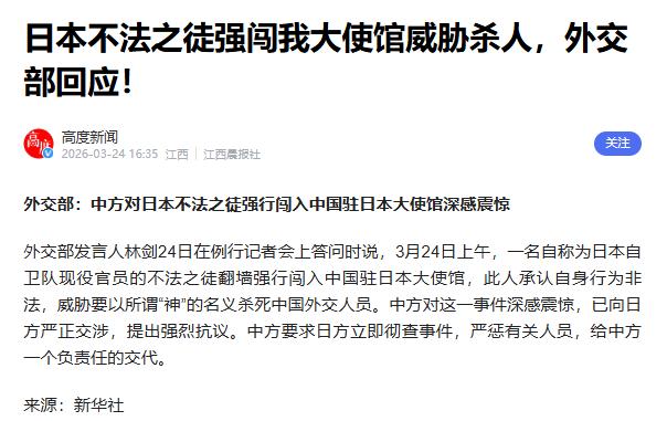 日本不法之徒强闯中使馆威胁杀人?3月24日上午,一名自称为日本自卫队现役官员的不法之徒翻墙强行闯入中国驻日本大使馆,威胁要以所谓“神”的名义杀死中国外交人员。 现在日本反华的动作已经开始不再遮遮掩掩了,居然明目张胆地威胁我们的外交官。 说白了,这根本不是什么孤立的个人极端行为,而是日本国内极右翼思潮泛滥、官方纵容默许的必然结果,是日本反华势力彻底撕下伪装的铁证。 一个现役自卫队官员,敢公然翻墙闯入他国使馆,还敢赤裸裸威胁杀人,背后要是没有一股势力撑腰,没有官方的失管失教,借他一百个胆子也不敢这么做。 谁都清楚,这几年日本的反华操作越来越出格,早就不是以前那种“遮遮掩掩、虚与委蛇”的样子了。 以前还会装模作样喊几句“中日友好”,现在连伪装都懒得做,政客们频频参拜靖国神社,拿着历史问题反复挑衅中国,在钓鱼岛海域频繁搞军事演习,还联合美国在亚太地区围堵中国,炒作“中国威胁论”,甚至出台各种限制措施,打压中国企业在日本的发展,把中国当成了最大的假想敌。 而这次,现役自卫队官员直接闯使馆、威胁外交官,更是把这种挑衅从“口头叫嚣”变成了“实际行动”,说白了就是在试探中国的底线,就是要故意激怒中国。 有人可能会说,这只是一个人的极端行为,不能代表整个日本。可这话骗骗自己还行,骗不了所有人。 一个现役军人,一言一行都带着军方的烙印,他敢做出这种出格的事,本质上就是日本军方反华情绪的集中爆发,是日本政府长期对右翼势力纵容、对自卫队失管失教的后果。 这些年,日本一直在悄悄推动自卫队扩军,淡化和平宪法的约束,甚至明目张胆地发展进攻性武器,国内的极右翼势力越来越猖獗,“新型军国主义”的苗头越来越明显,而这次的事件,就是这种危险动向的直接体现。 更让人不齿的是,日本一边在嘴上喊着要改善中日关系,一边又纵容这种挑衅行为,言行不一到了极点。说白了,他们就是没诚意和中国好好相处,一边想从中国市场捞好处,一边又想靠着反华讨好美国、拉拢国内右翼势力,算盘打得噼啪响,可天底下哪有这么好的事。 要知道,外交使馆是一个国家的领土延伸,受国际法明确保护,任何国家都有义务保护他国使馆和外交人员的安全,日本连最基本的义务都做不到,还纵容自己的现役军人闯使馆、威胁杀人,这就是赤裸裸地侵犯中国主权,就是对国际法的公然践踏。 日本之所以敢这么嚣张,说白了就是有美国在背后撑腰。这些年,美国一直拉拢日本搞“印太战略”,就是想让日本当马前卒,遏制中国的发展,给日本递了不少“定心丸”,让日本觉得有美国撑腰,中国不敢怎么样。 再加上日本国内经济持续低迷,贫富差距扩大,政客们为了转移国内矛盾,就故意煽动反华情绪,讨好右翼势力,争取选票,把所有的问题都甩给中国,说白了就是无能,只能靠挑事来维持自己的统治。 可他们忘了,现在的中国早就不是以前那个可以任人欺负的国家了。中国外交部已经第一时间向日方严正交涉、提出强烈抗议,要求日方立即彻查事件、严惩凶手,给中方一个负责任的交代,这就是中国的态度——克制但不软弱,温和但有底线。 要是日本官方敢敷衍了事,敢纵容这种反华挑衅行为,中国必然会采取反制措施,让日本为自己的行为付出应有的代价,到时候吃亏的还是日本自己。 说句实在的,日本这种反华操作,根本就是搬起石头砸自己的脚。中日两国一衣带水,经贸往来密切,中国是日本最大的贸易伙伴之一,很多日本企业都依赖中国市场,一旦中日关系恶化,受损的首先就是日本的经济利益。而且,国际社会也不会认同日本的这种挑衅行为,毕竟侵犯使馆、威胁外交官是违反国际法的,日本这么做,只会让自己在国际上失去信誉,变成一个“麻烦制造者”,最终被国际社会孤立。 更值得警惕的是,这次的事件不是结束,而是开始。随着日本国内右翼势力的不断猖獗,随着美国对日本的不断纵容,日本的反华动作只会越来越出格,越来越肆无忌惮。 他们可能还会在钓鱼岛问题上搞事,还会联合美国在亚太地区搞军事演习,甚至还会出现更多类似闯使馆这样的挑衅行为,这些都给中日关系带来了巨大的风险,也威胁到了整个亚太地区的和平稳定。 但有一点可以肯定,中国绝不会容忍任何侵犯国家主权、威胁外交官安全的行为,也绝不会任由日本的反华势力肆意妄为。我们一直希望和日本和平相处、互利共赢,但这份善意不能被当成软弱可欺。 日本要是识相,就赶紧彻查此事,严惩凶手,反思自己的对华政策,从根本上杜绝此类事件再次发生,不然继续一条路走到黑,只会自食恶果。