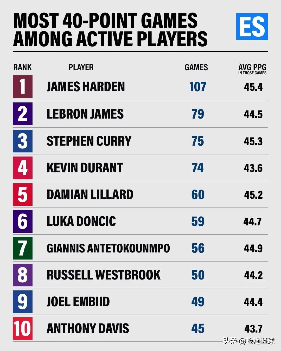 哈登遥遥领先啊 现役球员40+场次排行榜: 1.哈登——107场 2.詹姆斯
