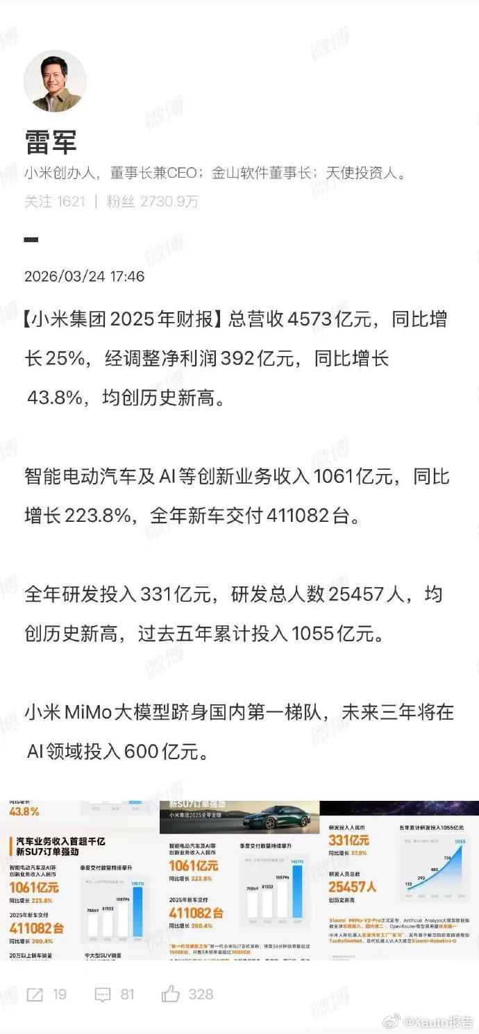 雷军回应小米2025年财报3月24日,小米雷军发布,小米总营收4573亿元,同比增长25%,经调整净利润392亿元,同比增长43.8%,均创历史新高。智能电动汽车及AI等创新业务收入1061亿元,同比增长223.8%,全年新车交付411082台。