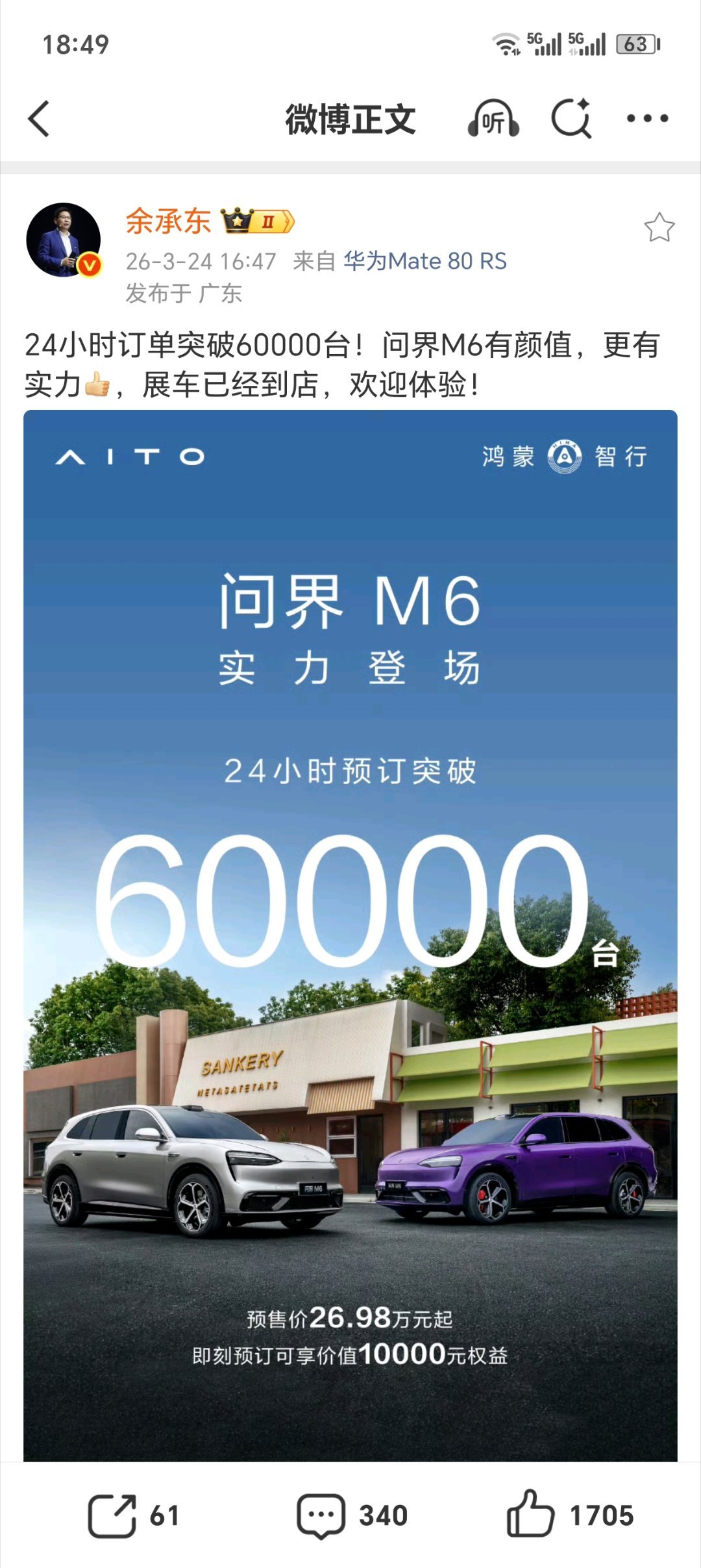 华为余承东在微博发文称,问界 M6 24 小时订单突破 60000 台。