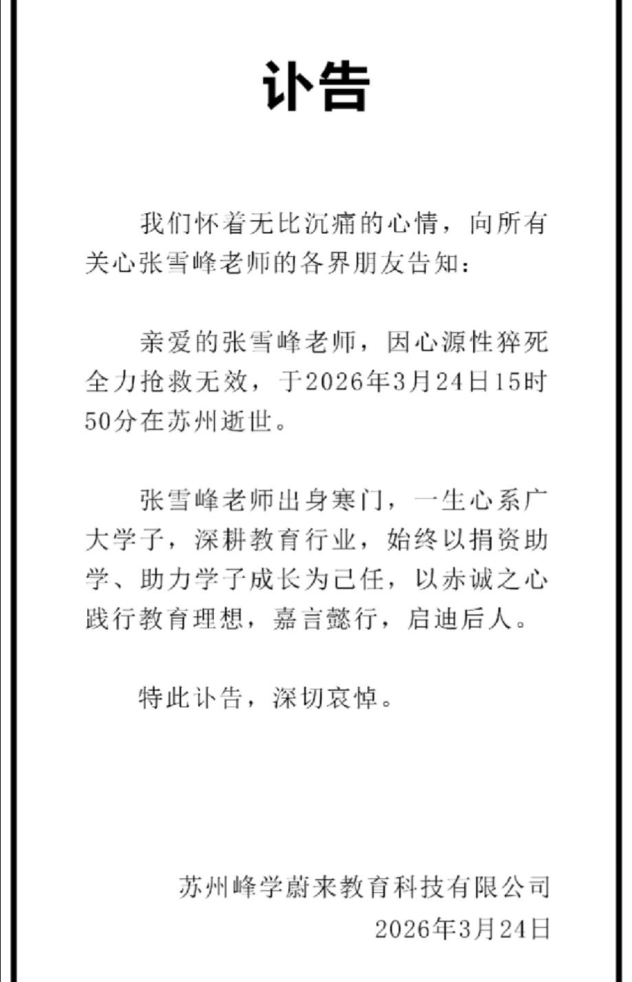 刷到这条消息的时候,心里咯噔一下。因为这回是真的了! 其实三年前,张雪峰身体就出过毛病。2023年6月,他因为胸闷心悸,被医院强制收治。大半夜十点多还发微博报平安,当时好多人猜这猜那,是不是说错话了?动谁蛋糕了?现在看,哪有那么复杂,就是身体在玩命报警了。 可他没停啊。 直播、录课、线下讲座,熬到凌晨是常态。有人说他后来还加上了跑步,本来熬夜就累得不行,这下可好,等于把身体最后那点底子都掏空了。从中医上讲,这叫劳逸结合没弄明白,累的时候得养着,硬撑再消耗,迟早撑不住。 他自己从齐齐哈尔一个小城拼出来的,太知道普通家庭的孩子缺什么信息了,所以拼命讲,恨不得把所有坑都帮人填平。 大家喜欢他,不就图他实在、敢说、不装吗? 结果呢,2026年3月24号,消息突然就炸了,那时候已经心脏骤停过一次。上午还有人刷到他直播呢,转眼人没了。41岁。 话说回来,要是三年前那次住院,他能真听进去身体的话,少熬几个夜,别硬撑着跑步,哪怕稍微缓一缓……可能就不是今天这样了? 可惜没如果。 张老师,一路走好!这回可真得歇着了。 教育大v张雪峰 张雪峰求职 张雪峰停播