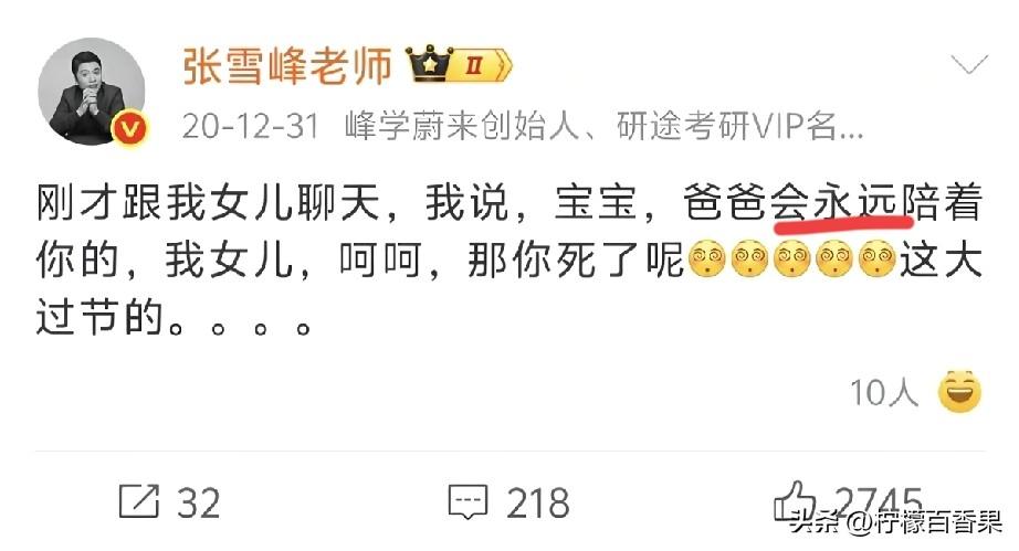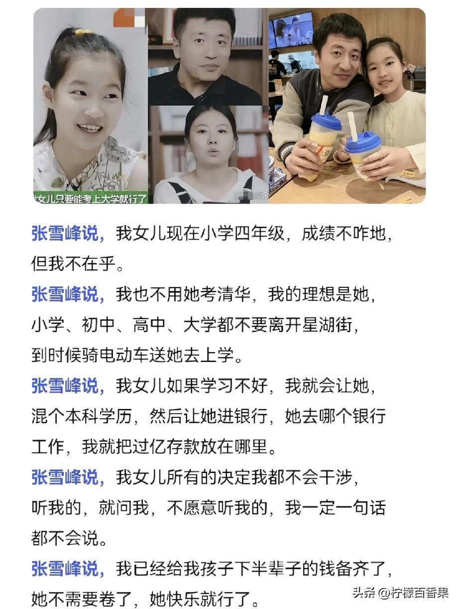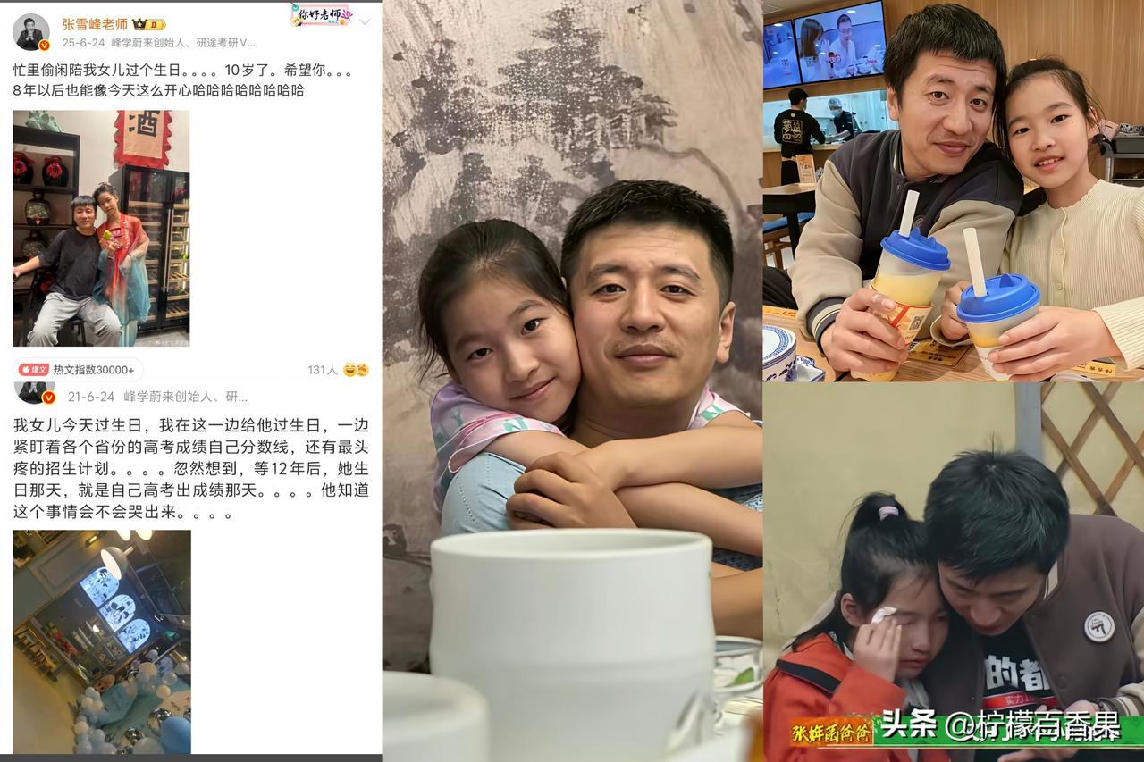 全网都在悼念张雪峰,可最难过的从不是网友,也不是旁人,是他才11岁的小女儿。 他真的把所有温柔和偏爱都给了孩子。明明忙到连休息的时间都没有,再累也会抽空陪女儿;他早早为女儿铺好路、做好规划,却从不强行干预,永远尊重孩子的想法。 他曾笑着说,自己的人生目标是“哪天我死了,各大平台热搜挂着‘张雪峰死了’,能成为一代人的回忆”。没想到这句玩笑,竟成了真。 他给女儿的爱,是最硬核也最温柔的兜底: 女儿四年级成绩平平,他从不在意,只盼她一辈子留在星湖街,他骑电动车就能送她上学; 他早早备好了女儿下半辈子的钱,说哪怕只混个本科,进银行工作,他就把过亿存款存进去,让她一辈子不用为钱发愁; 他从不干预女儿的选择,只说“愿意听我的就问我,不愿意我一句话不说”; 当女儿奶声奶气说“爸我要考清华”,他嘴上打趣“能考上苏大就不错了”,转头却红着眼说“你能考上,我啥都不干,全国各地见庙就磕头”。 他总说,自己拼尽全力,就是想让女儿长大后不用像普通人那样内卷,能有更多选择的自由。 可他才42岁啊,那个为千万学子指路的男人,那个承诺要陪女儿长大的爸爸,突然就倒在了苏州的春天里。 11岁的小姑娘,再也等不到爸爸骑电动车送她上学… 热搜真的如他所愿,只是这份“一代人的回忆”里,全是对那个小丫头的心疼。。 他总说要陪着女儿长大,可这一次,他食言了。 那个为万千学子指路的人,再也不能牵着女儿的手,陪她长大、听她说话了。11岁的小姑娘,从此再也没有爸爸了。