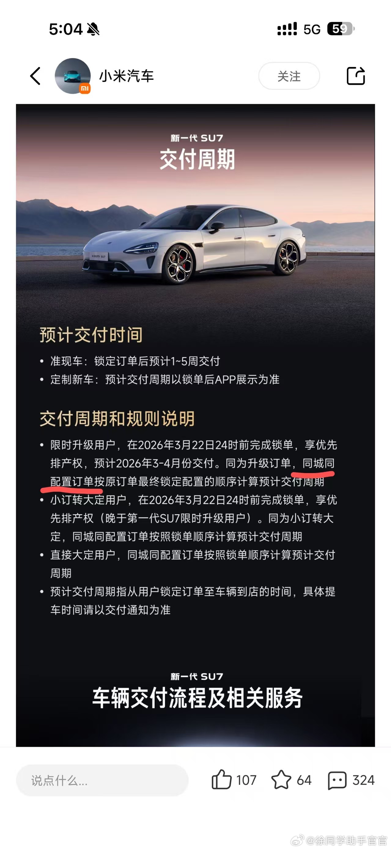 ❓为什么同时间锁单会有1周的差距❓因为新一代小米SU7的交付规则与以往有所不同(见图二)1️⃣第一优先级:老SU7订单升级为新一代,同时严格按照【老订单】的锁单顺序进行生产2️⃣第二优先级:小订转大定,且在【3月23日前】锁单的享受第二优先排产,同样按照锁单顺序生产3️⃣第三优先级:发布会当天大定,处于第三生产梯队,按照锁单顺序就行排产