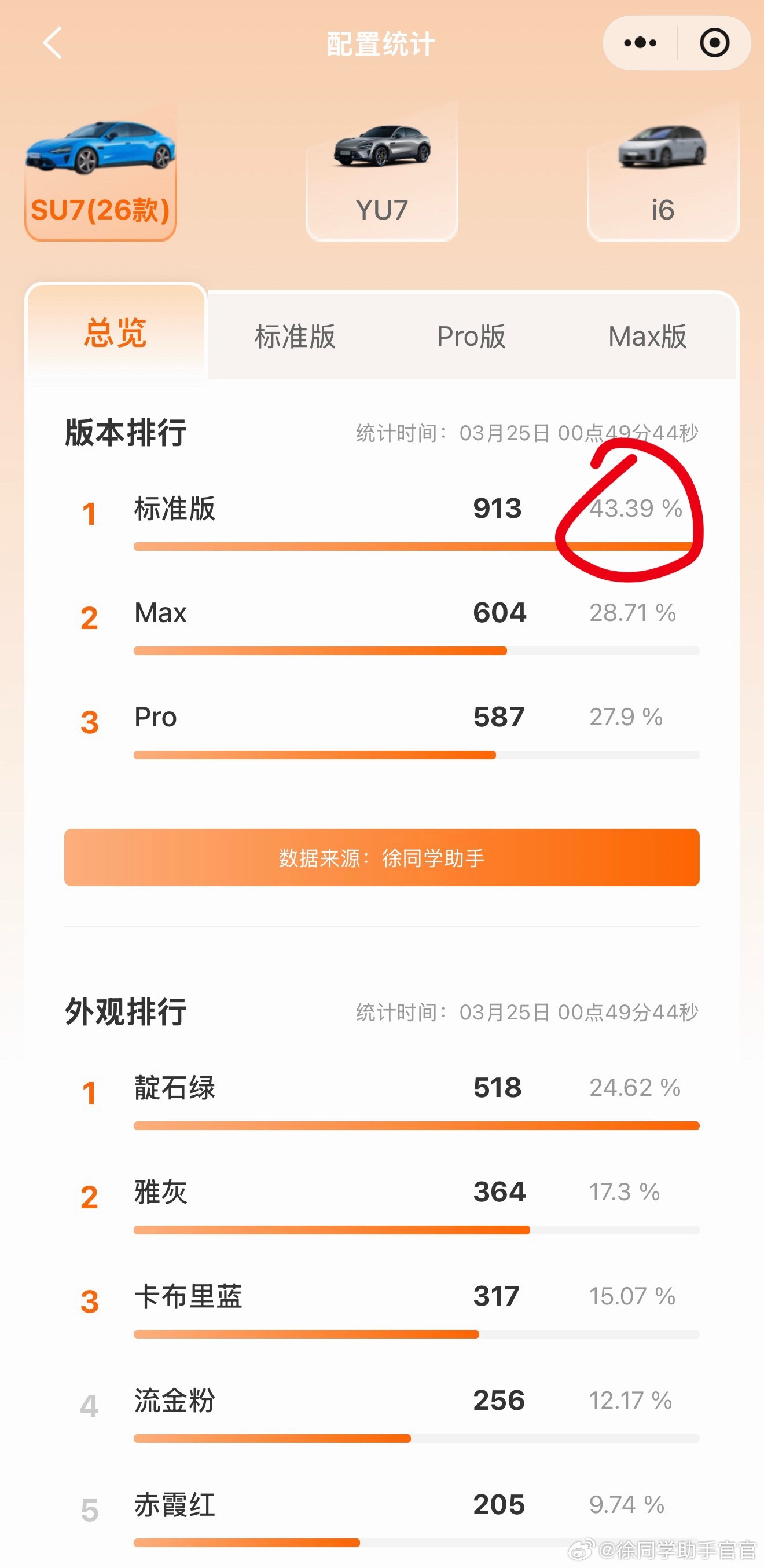 【徐同学助手】统计到的标准版占比已经超过了40%,锁单量排在第一位,正是说明了等待时间为什么要多一周。