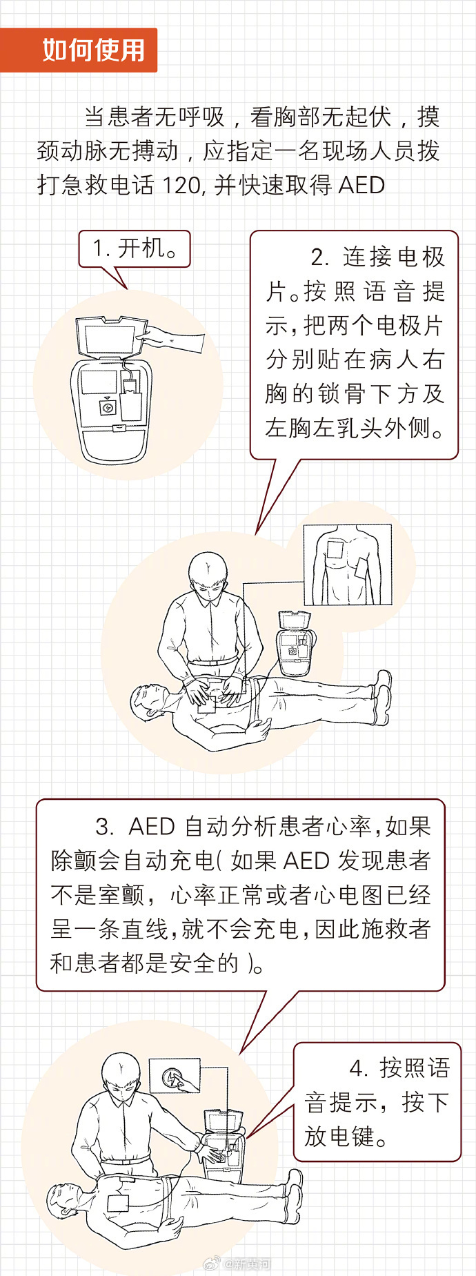 到底该如何使用?遇到他人突然倒地,若拍打患者肩部并大声呼喊,发现患者无反应;平视患者胸腹,也无起伏时,即可判定发生了心脏骤停。此时如果可以立即取得AED,首选AED,按说明书操作;若无法立即取得AED,立刻做人工心肺复苏,直到救护车到达。人工心肺复苏操作手法: