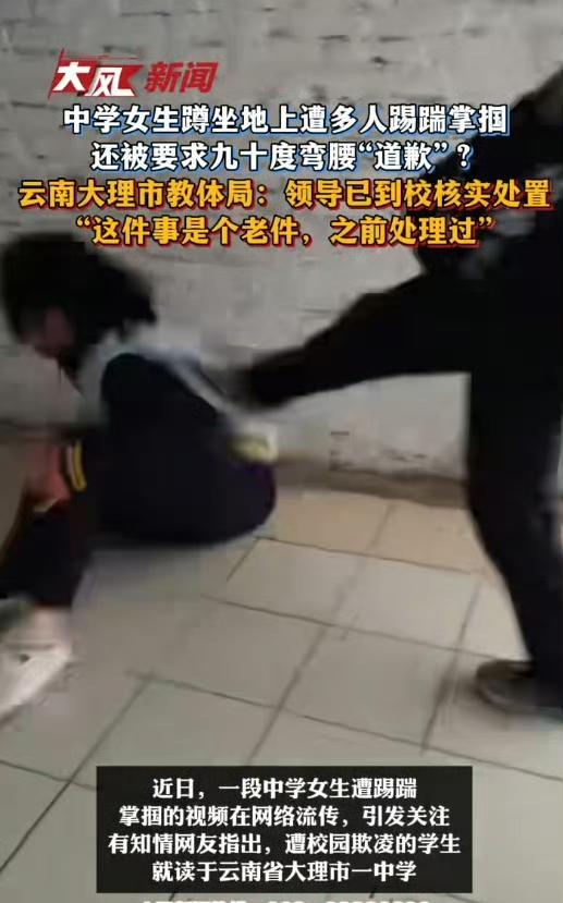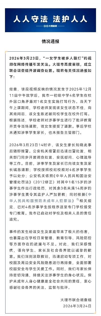 大理这起女生被殴打事件,实在是让人揪心不已。 事情发生在2025年12月11日,4名学生在校外因口角对一名女生进行打骂。当天老师发现女生状态异常,对打人者进行了批评教育并让其道歉。然而,学校事后既没有通知家长,也未向主管部门报告。直到2026年3月23日,家长得知此事后选择报警。 好在如今相关部门行动迅速,涉事学生和家长道了歉,学校对涉事学生作出处分,公安对15岁的涉事学生予以处罚,对未满14岁的责令监护人进行管教,还将4名涉事学生送往专门学校。希望这样的校园暴力事件不再发生,也给学校提个醒,遇到此类事情要及时沟通处理。 校园暴力,一直是社会关注的痛点。这起大理女生被殴打事件,看似得到了妥善解决,但背后反映出的问题却值得我们深入反思。 学校在事件处理中的失职令人担忧。老师虽进行了批评教育和道歉要求,可后续不通知家长、不上报主管部门的做法,无疑是对校园暴力的轻视。这不仅让受害者家长失去了及时知晓孩子遭遇的机会,更可能让打人者觉得自己的行为并未造成严重后果,从而助长不良风气。 对于涉事学生的处罚,虽然有了一定的措施,但也引发了一些思考。送往专门学校能起到一定的矫正作用,但如何真正让这些孩子认识到自己的错误,树立正确的价值观,是摆在我们面前的难题。而对于未满14岁的学生,仅责令监护人管教是否足够有效,也需要进一步探讨。 这起事件也给其他学校敲响了警钟。学校应该建立完善的校园暴力处理机制,一旦发生类似事件,要第一时间通知家长,及时上报主管部门,共同采取措施,将伤害降到最低。同时,加强对学生的法治教育和品德教育,从源头上减少校园暴力的发生。 希望社会各界能更加重视校园暴力问题,形成家庭、学校、社会三位一体的防护网,让每一个孩子都能在安全、和谐的环境中成长,不再让这样揪心事件重演。 未成年人殴打