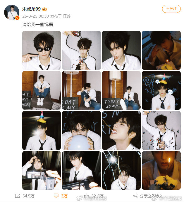 #宋威龙27岁庆生照# 3月25日,分享照片并配文:“请给我一些祝福。”照片中,迎来27岁生日的宋威龙穿着干净的白衬衫,佩戴黑领带,风格慵懒又精致,自带少年感。(现代快报)更多消息:#27的宋威龙##短剧撞脸迪丽热巴别甩锅AI##周杰伦新专辑最平淡的歌曲是太阳之子##陈哲远一笑随歌飙升榜第二##火了还没适应的明星最好玩了##李卿早期垃圾小食品从夯到拉排序##周杰伦那天下雨了#(编辑:杨雨桐;审签:周乐瑞)