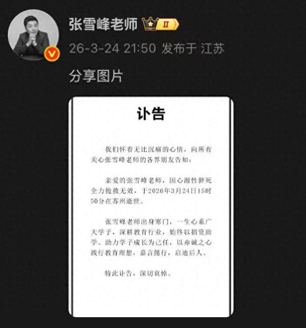 张雪峰因心源性猝死全力抢救无效去世,对于死亡其曾坦言:希望自己能成为一代人的回忆,想在自己墓碑上写:人生真好玩,下辈子还来 2026年3月24日夜里,一条消息让不少正在挑灯备考、或是曾靠着升学指引熬过迷茫期的年轻人,盯着屏幕半天回不过神。 张雪峰突发心源性猝死,事发后经医护人员争分夺秒全力抢救,终究没能留住生命,走完了他41年的人生。 消息发酵的速度远超想象,各大社交平台的相关词条迅速攀升,很多人下意识点开收藏夹里他曾经的讲课片段、访谈录屏。 看着那个永远语速轻快、眼神透亮的身影,很难相信那个总是充满干劲的人,真的就这样永远停在了41岁。 从一名普通的高校毕业生,到后来成为家喻户晓的升学规划引路人,张雪峰的起步没有任何捷径可走。 刚踏入考研指导这个领域时,他没有人脉加持,没有成熟的团队助力,只能沉下心来,一点点啃透全国数百所高校的招生细则、专业培养方向、就业发展前景。 把那些零散杂乱的升学信息,逐一梳理、拆解、归纳,转化成普通人能听懂、能用上的实用内容。 不仅如此,不同于传统教育从业者的严肃刻板,他从不照本宣科念资料,也不堆砌冰冷生硬的数据。 而是用轻松诙谐的语气,结合贴近生活的表达,把原本让人头大的院校筛选、专业对比、志愿填报等问题,讲得通透又好懂。 以前的他也是寒门学子中的一员,所以他懂,很多寒门学子拼尽全力备考,却因为信息差选错方向,很多家长掏空心思帮孩子铺路,却对着繁杂的选择无从下手。 于是,他精准抓住这份痛点,针对性给出自己的建议。 哪类分数段对应哪些院校,哪些专业的发展路径更适合普通家庭,哪些报考误区一定要避开,他都掰开揉碎讲透彻。 就这样他靠着日复一日的积累和实打实的专业度,慢慢扎根在一代年轻人的升学记忆里,成了不可替代的存在。 随着个人影响力不断扩大,张雪峰没有满足于当下的成绩,而是选择把升学规划这件事做得更深入、更全面,一手创办了苏州峰学蔚来教育科技有限公司。 他的初衷从来不是做短期的流量生意,而是搭建一个更系统、更靠谱的平台,为学生们和家长们提出建议。 他从不主动宣扬自己的公益行为,不借善举博眼球,只是低调落实每一笔帮扶、每一次资助——帮扶家庭经济困难的学生,为他们解决学费、学习物资等实际难题,助力他们顺利完成学业。 3月24日,41岁的他,因为心源性猝死,生命骤然画上句号。 这份突如其来的离别,难免让人满心遗憾。 而更让人心里发酸的是,面对生死这个沉重的话题,张雪峰早前在一场面向大众的公开访谈里,早已卸下所有顾虑,格外平静坦然地聊起过自己的想法。 当时主持人顺着话题问及他对身后事的安排与心愿,他直白道出了两个最真切的愿望。 一个是盼着自己这辈子为万千学子做的这些事,能被大家记在心里,成为一代学生们和家长们的专属回忆。 另一个是等生命走到尽头的时候,要在墓碑上刻下一句最纯粹的话——人生真好玩,下辈子还来。 他当时还笑着解释,人活一辈子,本质就是体验世间的酸甜苦辣,体验那些从未经历过的美好与温暖。 这辈子他为了热爱的事业拼过,为了信任他的人付出过,也收获了被认可的甜,这样的人生足够充实,足够圆满。 讣告发布之后,全网的悼念声愈发浓烈,大家纷纷用自己的方式表达不舍。 曾经的他说想要的一代人的回忆,而这份心愿早已稳稳落地。 他的名字、他的话语、他带给无数人的温暖与指引,不会因为生命的逝去而消散,反而会在一代代学子的传承里,长久留存。 往后岁月里,想必每当有人提起考研升学,提起那个直白又真诚的张雪峰老师,都会想到他曾用自己的光和热,照亮了无数年轻人的前行之路。 (信息来源:封面新闻2026-03-24《张雪峰因心源性猝死逝世 年仅41岁》、新黄河2026-03-24 《张雪峰因心源性猝死全力抢救无效去世,对于死亡其曾坦言:希望自己能成为一代人的回忆,想在自己墓碑上写:人生真好玩,下辈子还来》)