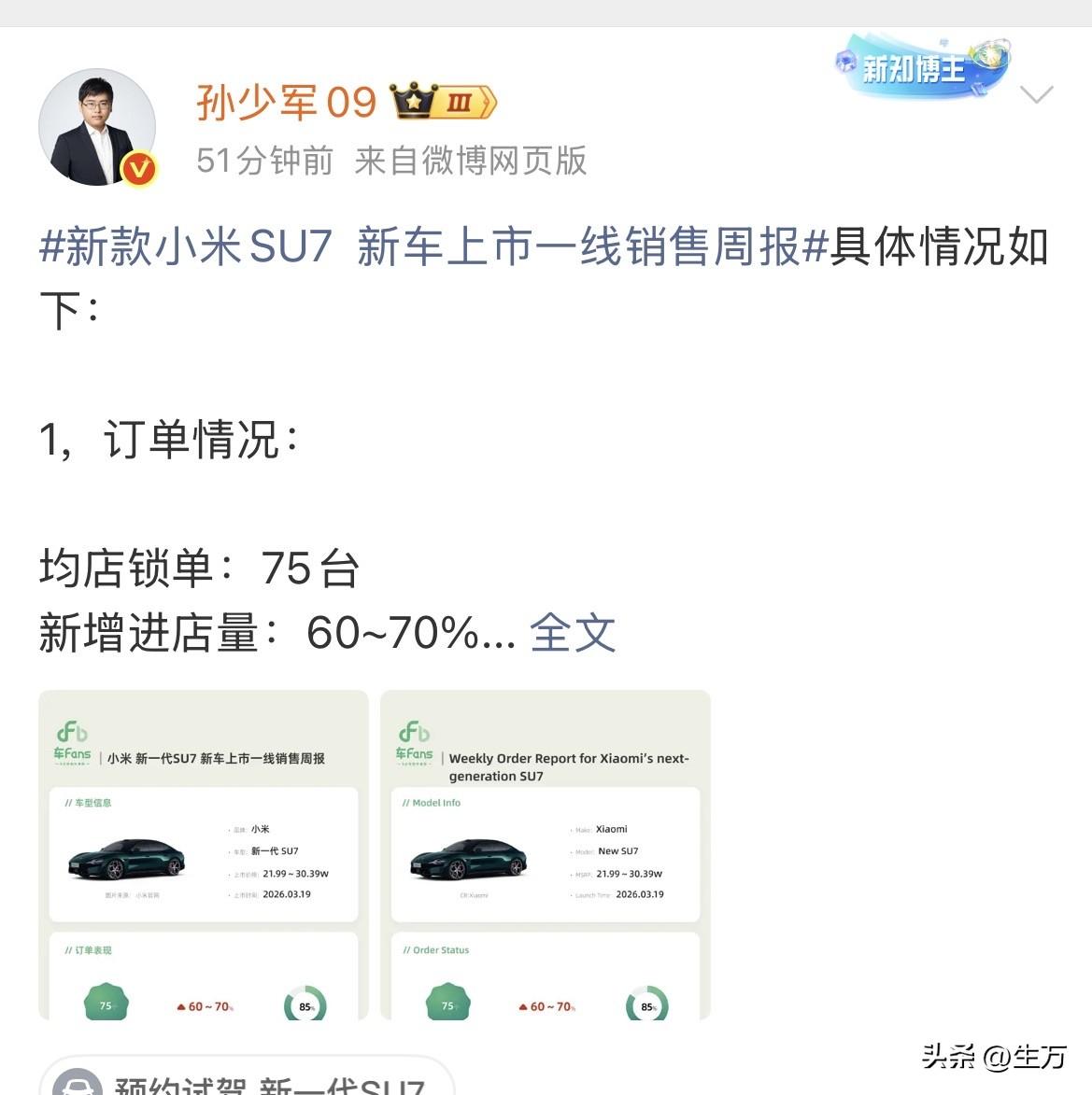 孙少军:全新小米SU7锁单已经超过了3.5万台! 就在刚才,孙少军发出了全新小米SU7最新的用户画像: 这个车从19号上市,到今天也才六天左右的时间,但是截止目前他的所在量已经超过了3.5万台,要知道前天雷军直播的时候,这个车的量也才30,000台,这才过了一天的时间就增加了五千台,说明这个车现在慢慢地被更多的人知道,每天的增长需求正在呈现出上涨的趋势,说明后期的用户需求量比前几天更大。 从数据可以看到全国这么多小米的门店里面,这台车每天的平均锁单量超过了75台,这个数字可能看起来没有感觉,但是如果你在门店里面去看的话,一天能够卖出去75台车,这个数字任何一个同行来说都是不容易做到的。 而且可以看到男女的比例越来越接近,55% 和45%,启动这些人群当中有差不多70%的人是选择置换的,也就是说第一代小米SU7的用户当中,有超过三分之二的人会继续选择他们的新车,说明这个车的用房粘度比较高。 但另外一个数据比较有意思,那就是这么多订单当中有45%的标准版,好多人都是选择入门级别的,只有在一二线城市,选择Max版本的人比较多。
