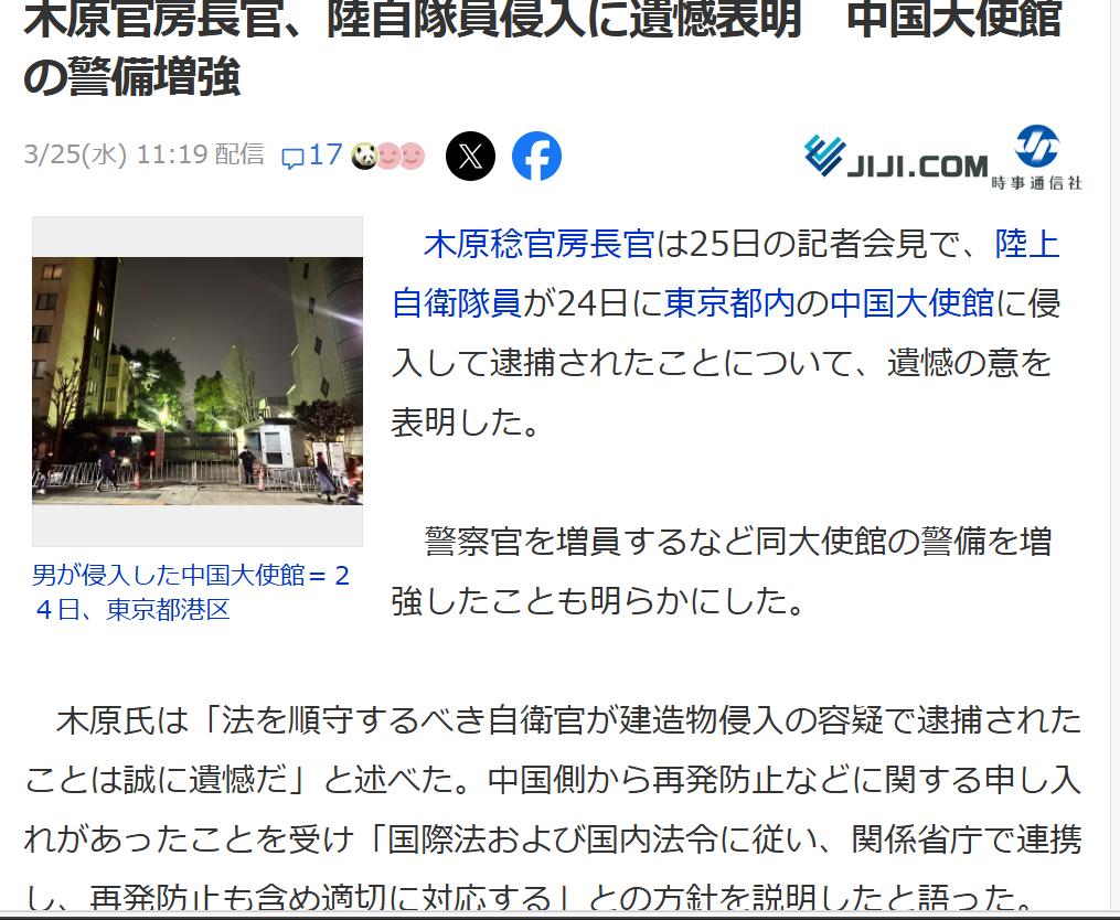 日官方对中使馆被入侵事件仅表达“遗憾” 3月25日,日本内阁官房长官木原稔在新闻发布会上,对日本陆上自卫队现役人员24日入侵中国驻如本大使馆一事表示“遗憾”。 木原稔还透露,中国大使馆周边的安全措施已经得到了加强,增加了警察人数。 木原稔表示:“一名本应遵守法律的自卫队人员因涉嫌非法侵入建筑物被逮捕,实在令人遗憾。” 针对中方关于防止再次发生的要求,他称:“与相关部门和机构配合,依国际法和日本国内法律法规,采取适当应对措施,包括防止再次发生的措施”。 据日本媒体报道,该名自卫队员手持刀具,叫嚣:“以神的名义杀中使馆人员”。