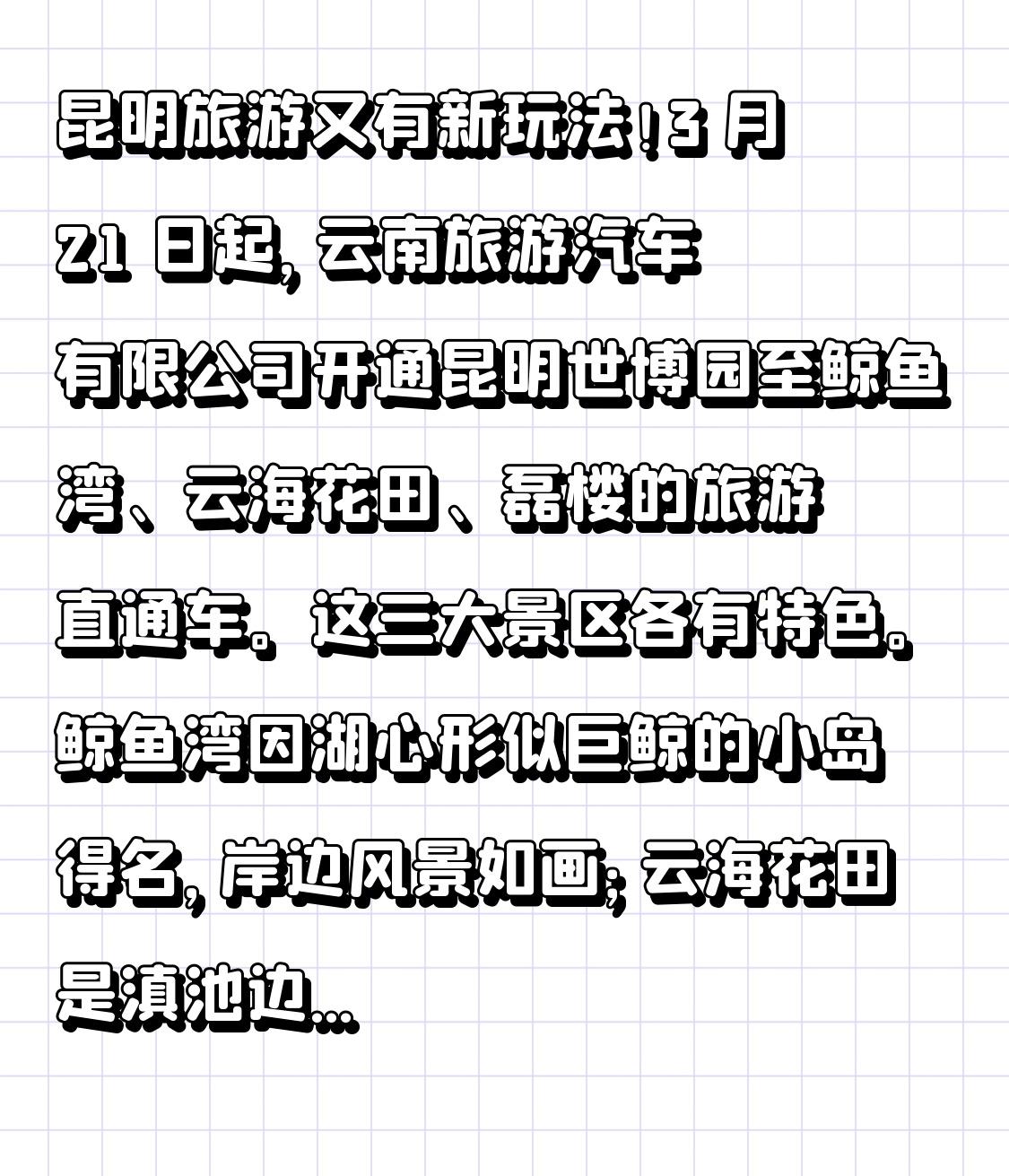 📍🌈昆明旅游又有新玩法!3 月 21 日起,云南旅游汽车有限公司开通昆明世博园至鲸鱼湾、云海花田、磊楼的旅游直通车。 🌸🏕这三大景区各有特色。鲸鱼湾因湖心形似巨鲸的小岛得名,岸边风景如画;云海花田是滇池边的“彩色调色盘”,四季花海美不胜收;磊楼呈“品”字布局,适合静心休憩。 🚗🚙直通车每周六、日 13:30 从世博园发车,18:00 返程,每站游览约 1 小时。只需 49.9 元,就含往返车费、云海花田门票和保险,可在“云南旅游专线”公众号或现场购票。这性价比,还不冲?