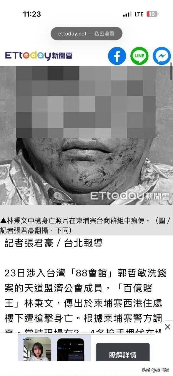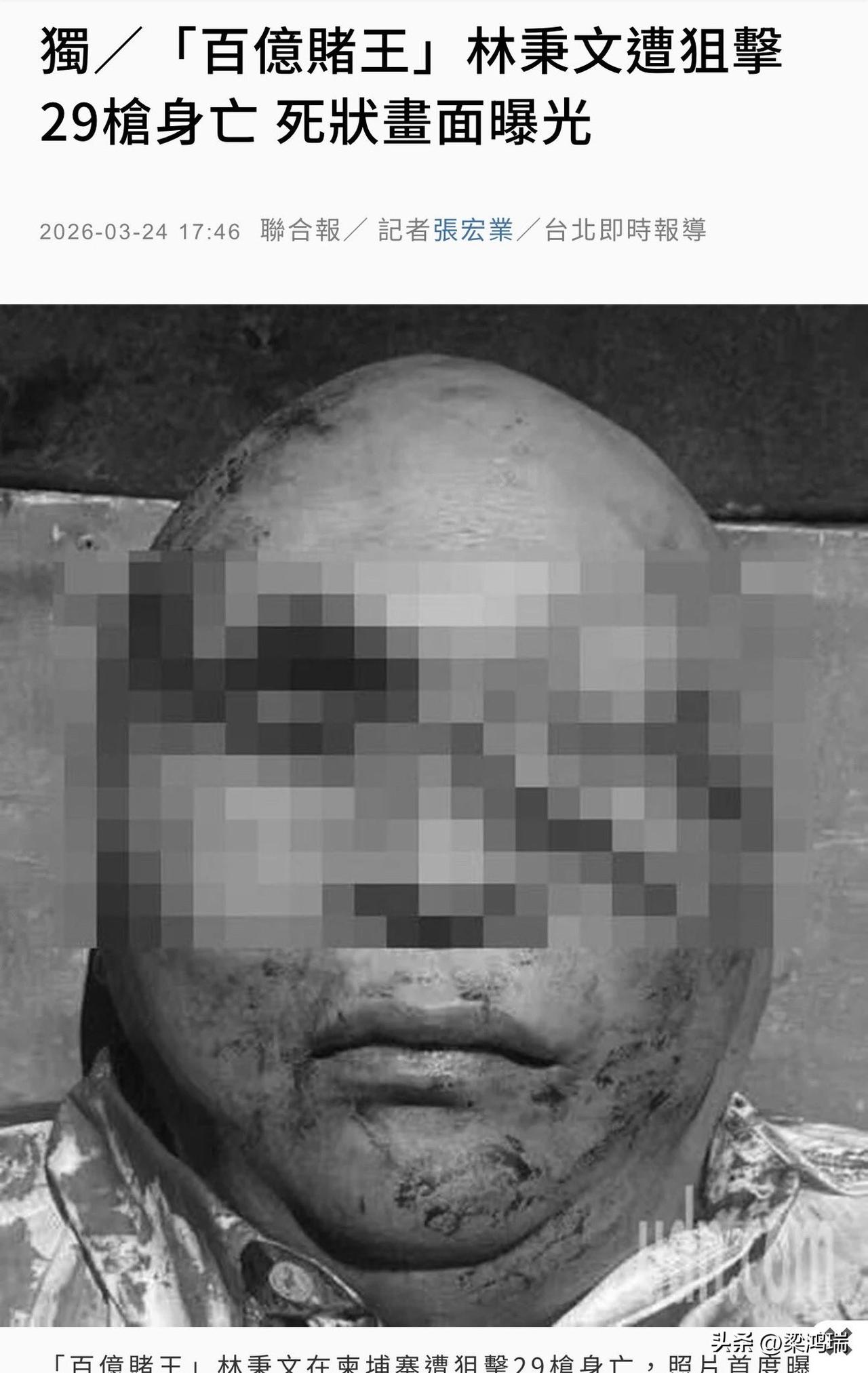 台湾“亿万赌王”林秉文,因涉嫌6.8亿美元的“88俱乐部”洗钱案而潜逃,周日晚间在其位于西哈努克城的住所外遭枪击身亡。他身中29枪,其中5枪击中头部。他通常出行时有三名保镖随行,但事发时他独自一人在遛狗。监控录像显示,一辆黑色轿车已跟踪他数日。目前已有两名嫌疑人被捕。 案发现场的首批照片已在柬埔寨的台湾商业聊天群中流传。